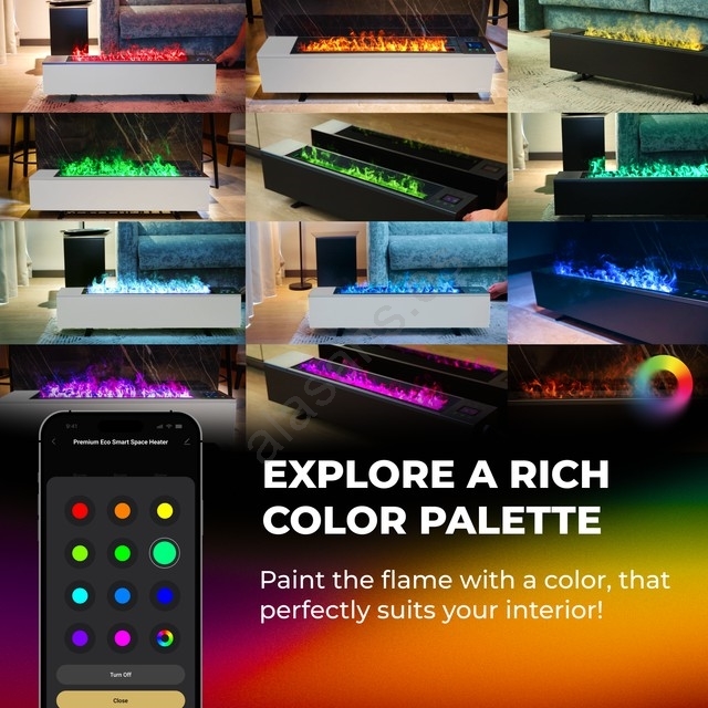 • El aparato se puede controlar mediante una app inteligente por Wi-Fi; permite programar temporizador, seleccionar modos de calefacción y ajustar el color del efecto.