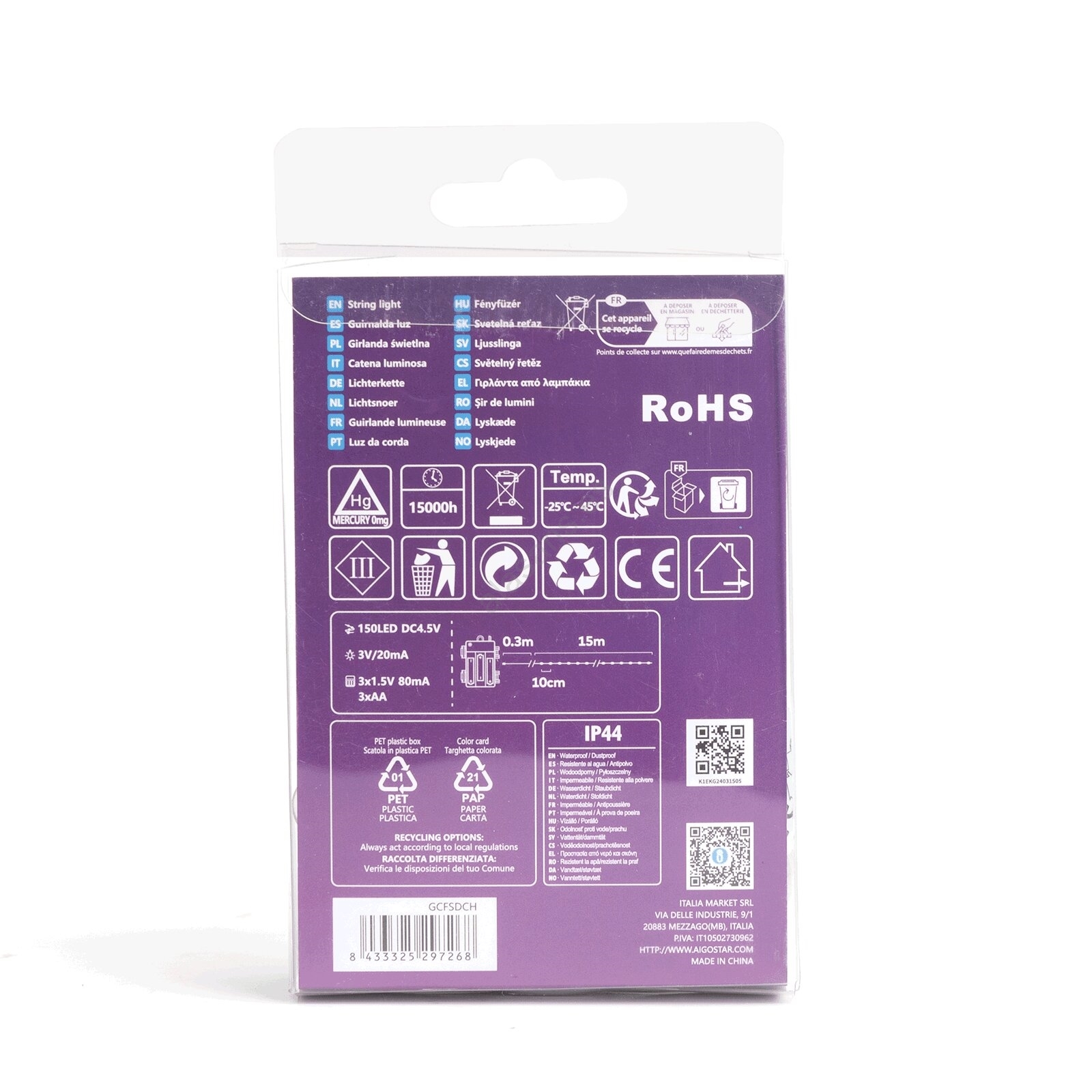 • Aigostar - Cadena de luces LED para exterior 150 LEDs/8 funciones/3xAA 15,3 m IP44 blanco frío