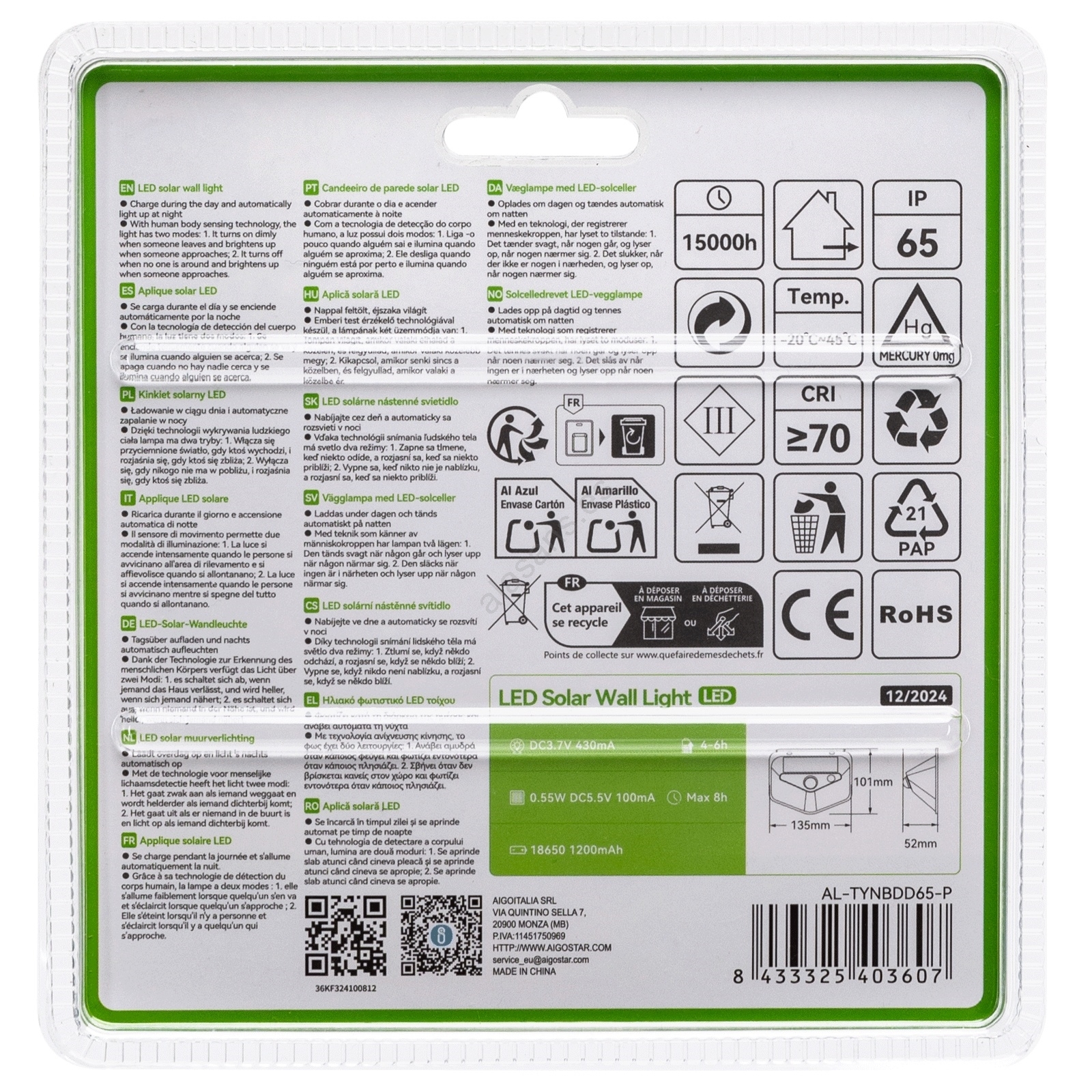 Aigostar - Luminaria solar LED con sensor LED/3,7 V 6500 K 500 mAh IP65 negra