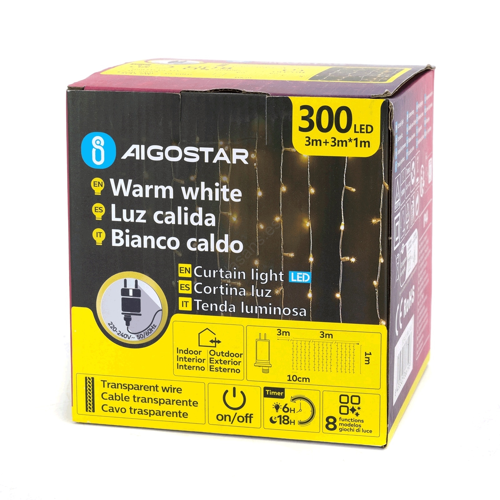 • Aigostar - Guirnalda navideña LED para exterior 300xLED/8 funciones 3x1m IP44 blanco cálido + mando a distancia