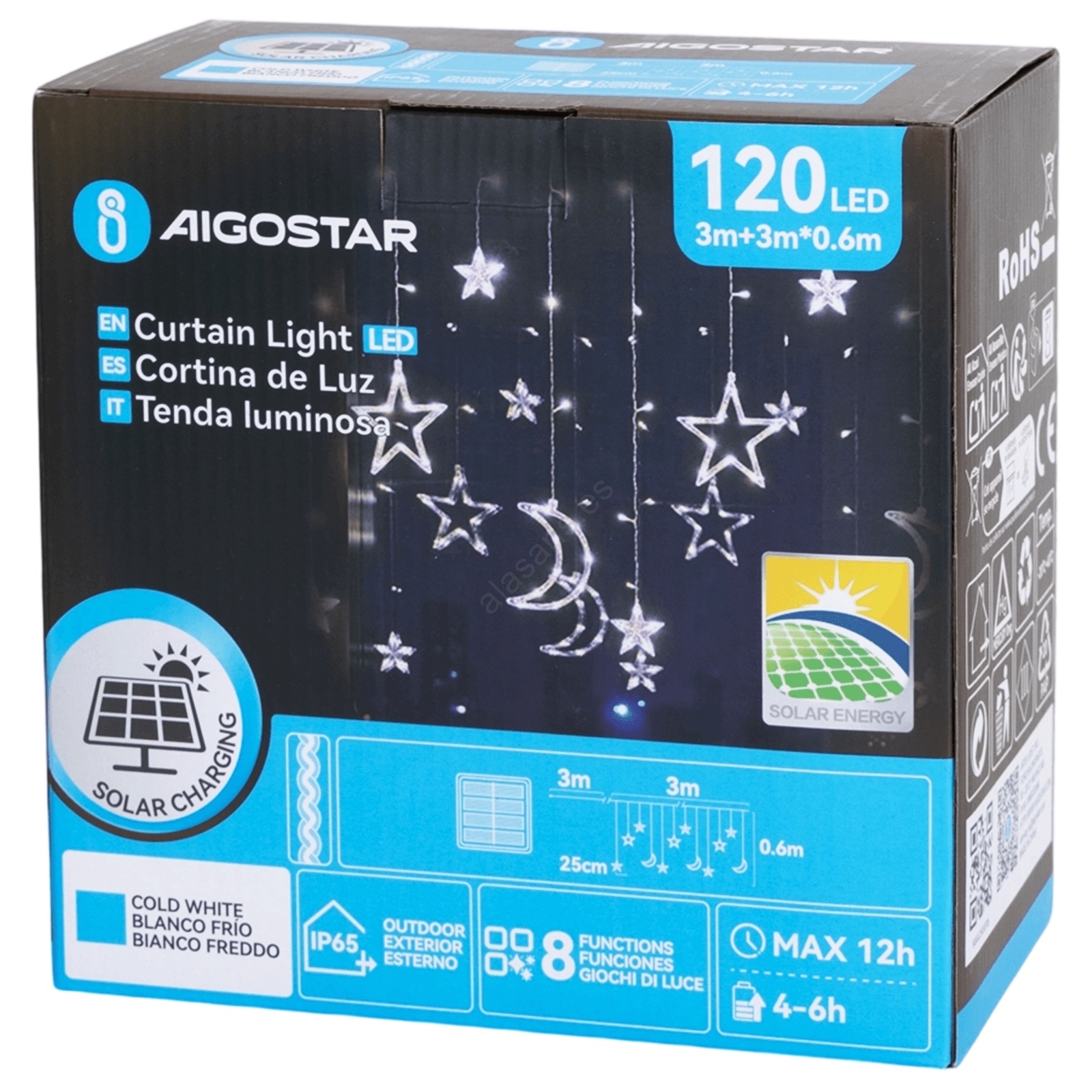 Aigostar - Cadena de luces LED solar para Navidad 120 LEDs/8 funciones 3x0,6 m 500 mAh IP65 blanco frío