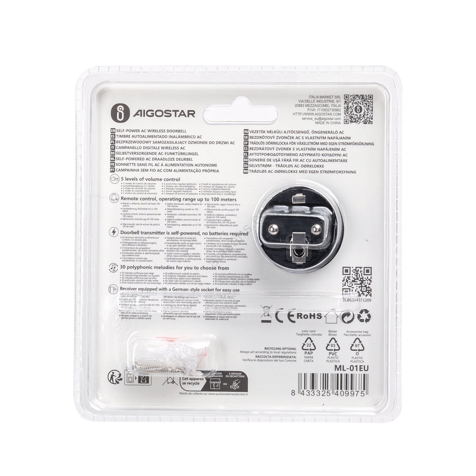 Aigostar - Timbre inalámbrico con enchufe integrado 1Z 230V IPX4 negro
