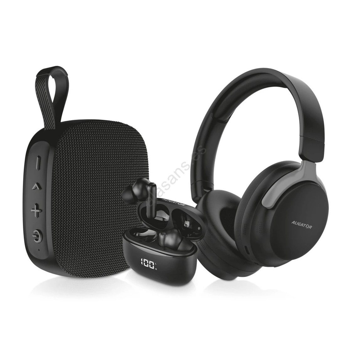 Aligator AUC001 - Combo de audio 3 en 1: auriculares de diadema 150 mAh, auriculares inalámbricos 200 mAh + 2x 30 mAh y altavoz 1200 mAh