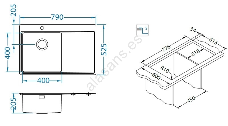 • ALVEUS 1103651 - Fregadero de cocina PURE 79x52,5 cm satin, derecho