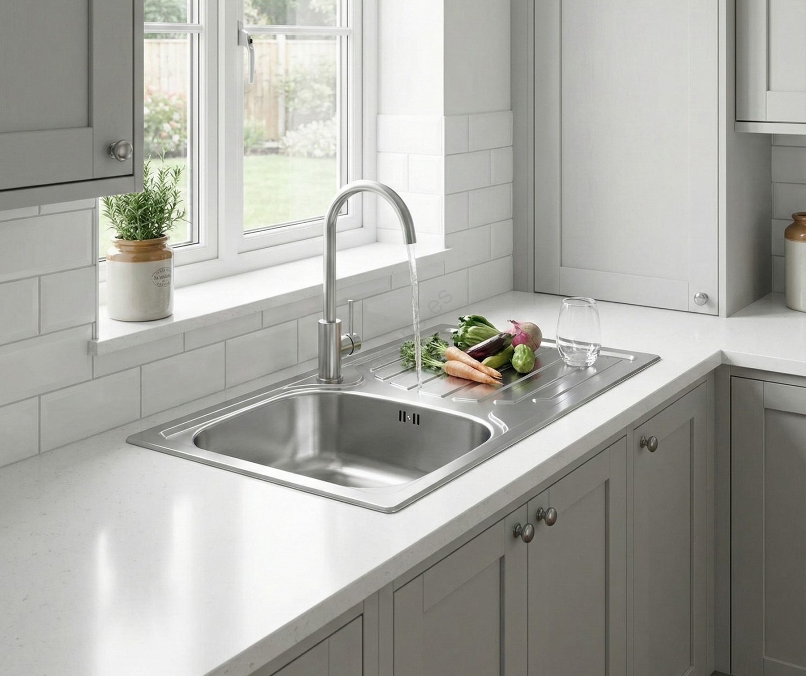 • Fregadero de cocina de acero inoxidable con diseño clásico, incluye un práctico grifo de fregadero.