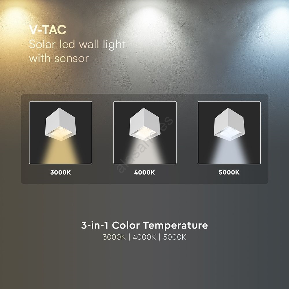 Aplique solar de pared LED con sensor, 9W/5V, 3000/4000/5000K, IP65, 2600 mAh, blanco