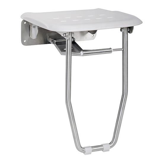• Asiento abatible para ducha con pata de apoyo para máxima estabilidad.