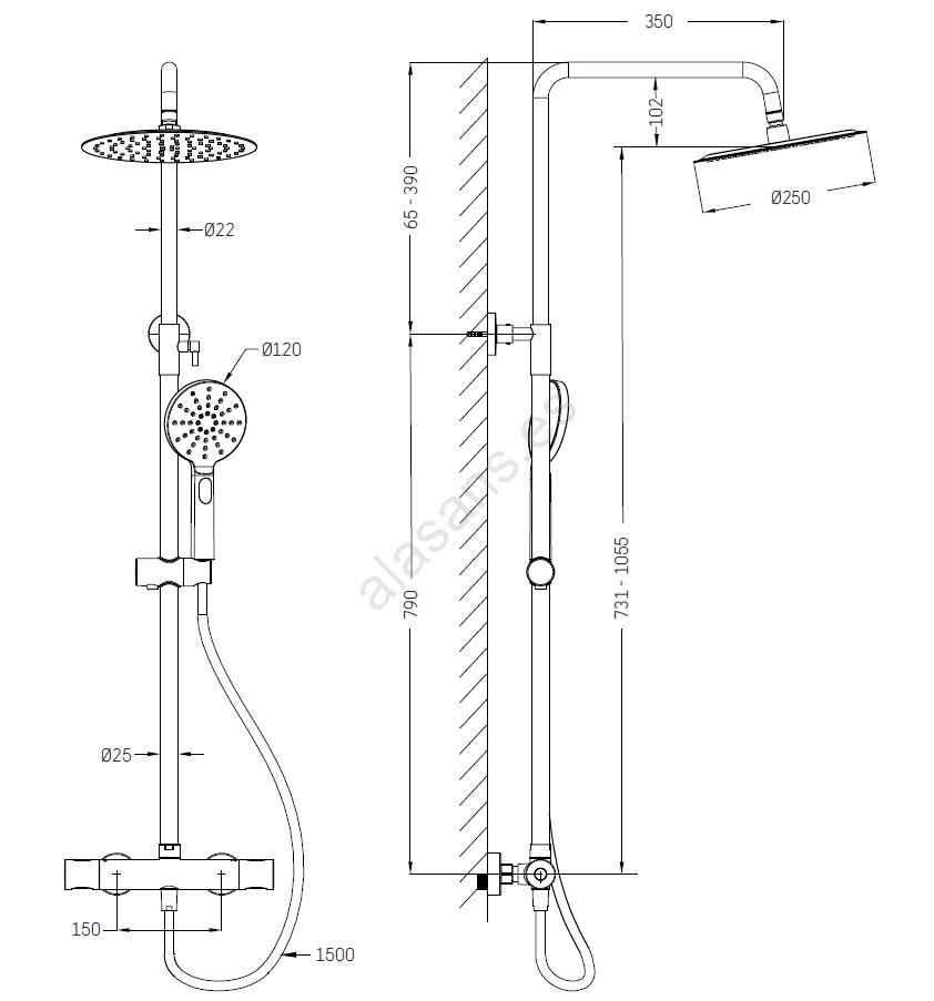 • Barra de ducha y rociador superior de acero inoxidable con acabado PVD.