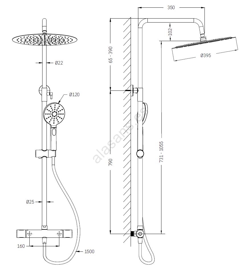 • Barra de ducha y cabezal superior en acero inoxidable con acabado PVD.