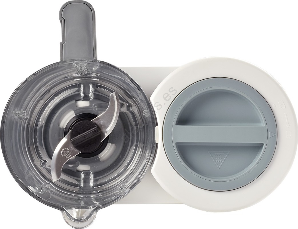 • Para triturar la comida, simplemente vacíe los ingredientes cocidos de la cesta en el recipiente principal transparente y triture (según la edad del niño, a un puré suave o a una textura más gruesa con trozos).