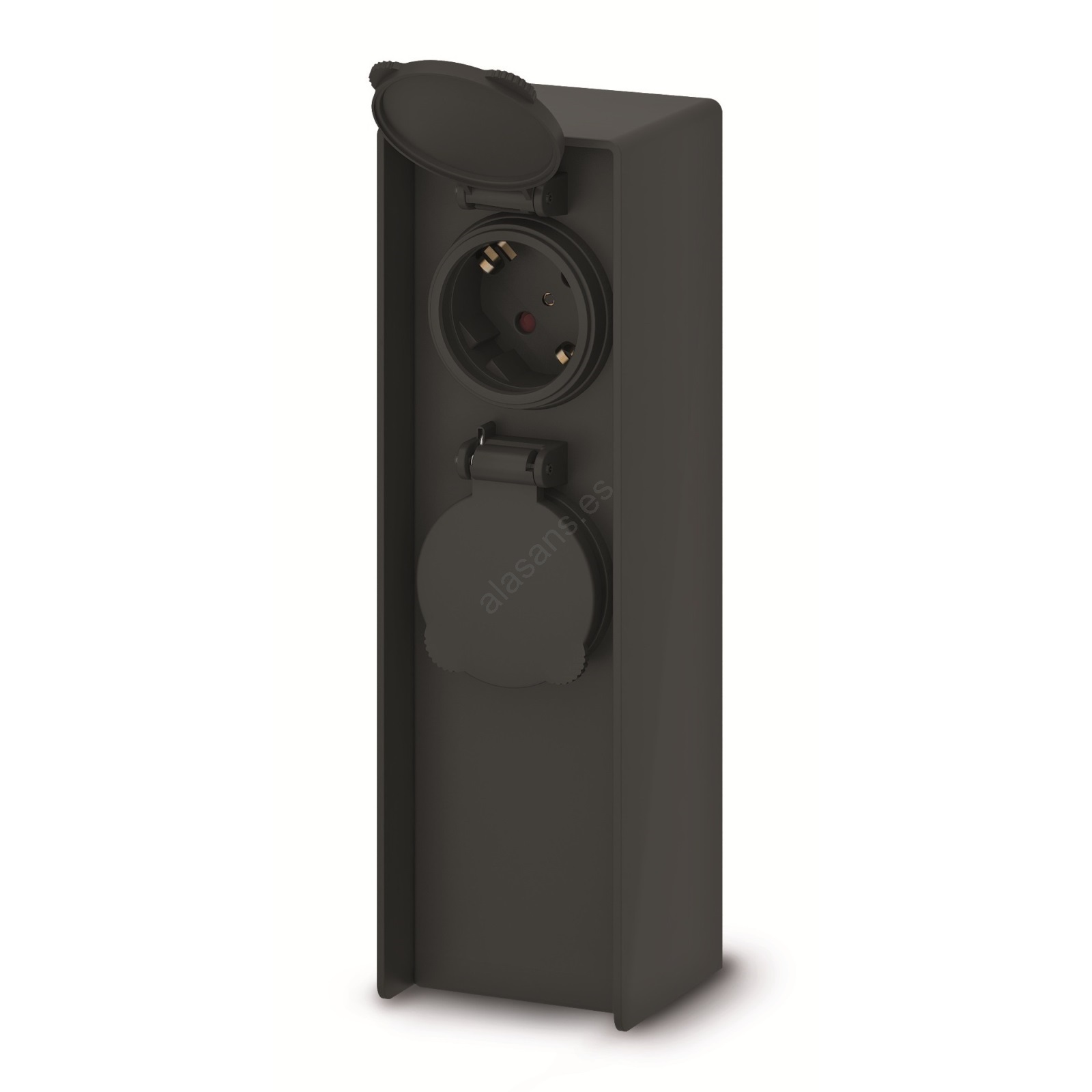 • Las dos tomas de corriente con protección infantil cuentan con tapas de cierre automático que las protegen frente a la humedad y el polvo.