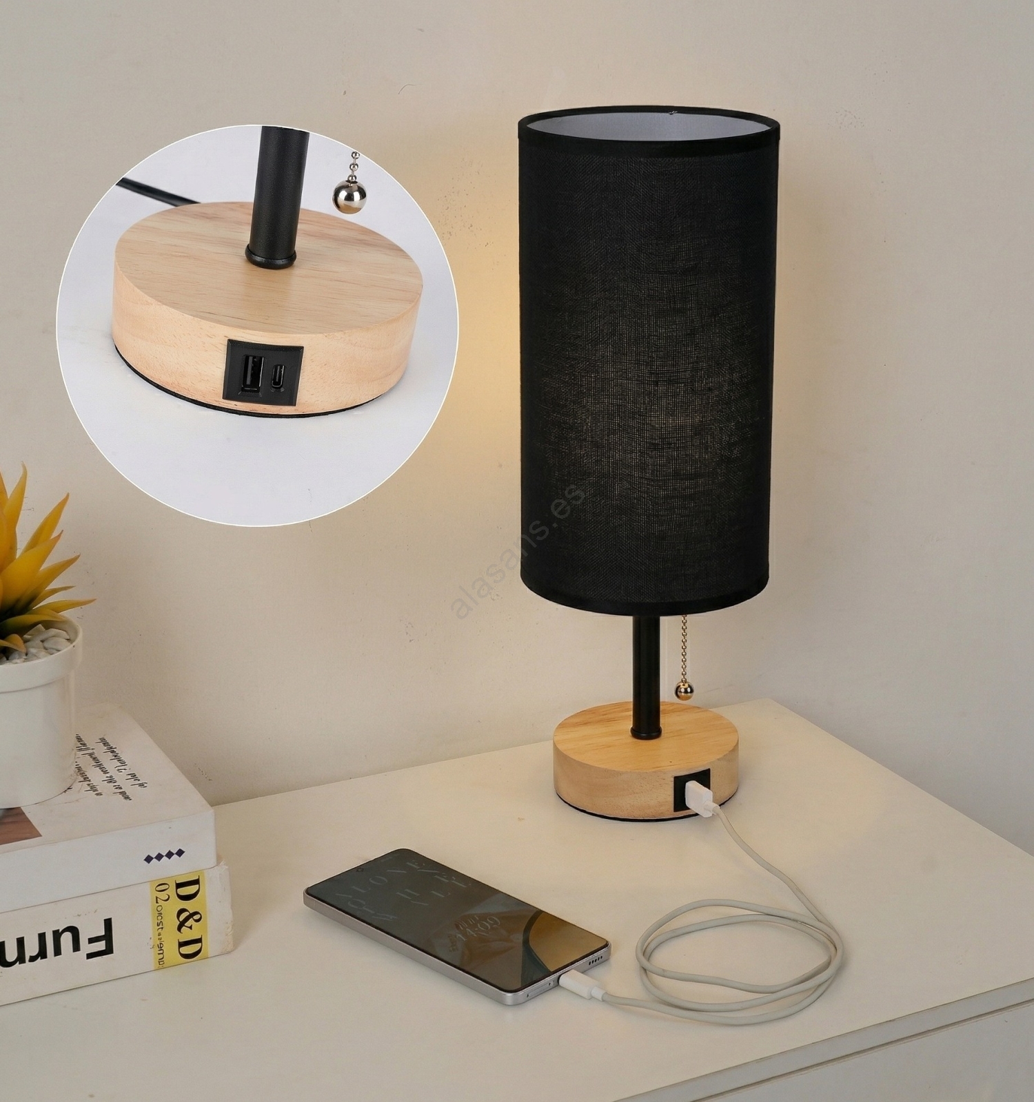 Brilagi - Lámpara de mesa con puerto USB TABLON 1xE27/25W/230V roble/negro