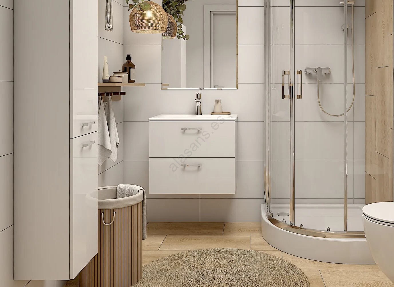 • Este mueble se adapta perfectamente a baños modernos, ofreciendo un aspecto limpio y un aprovechamiento práctico del espacio.