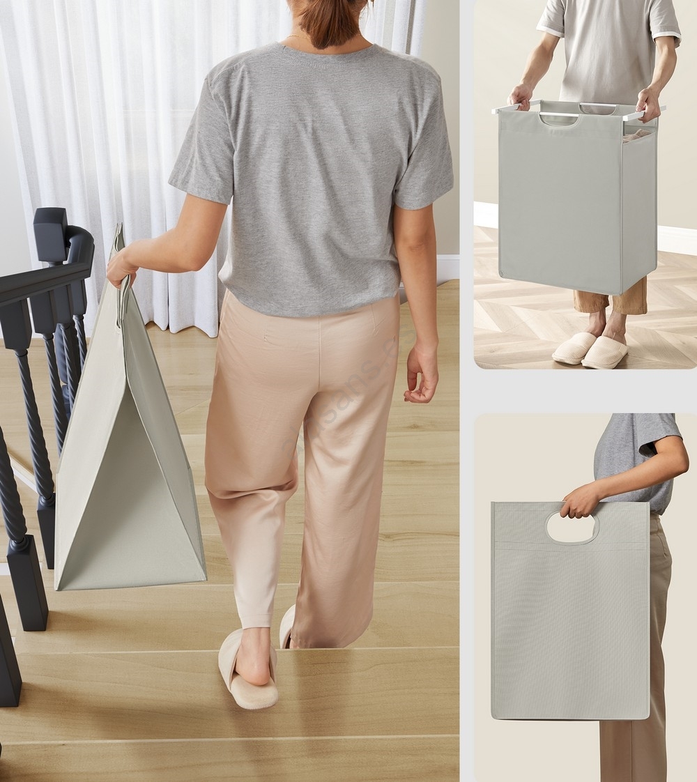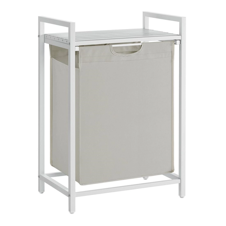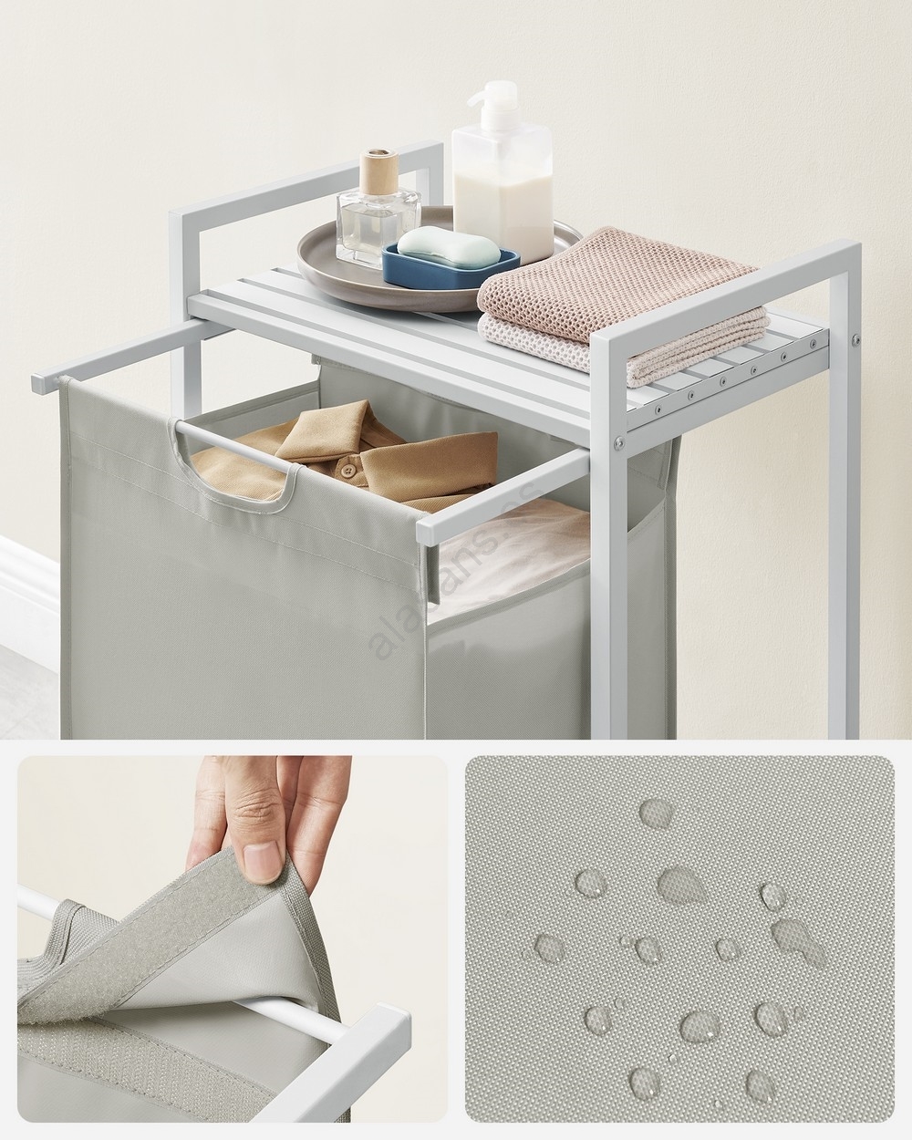 • 1 bolsa, 1 balda – Guarde la ropa en la bolsa de tela (65 l) y coloque detergente, suavizante y otros artículos en la balda superior.