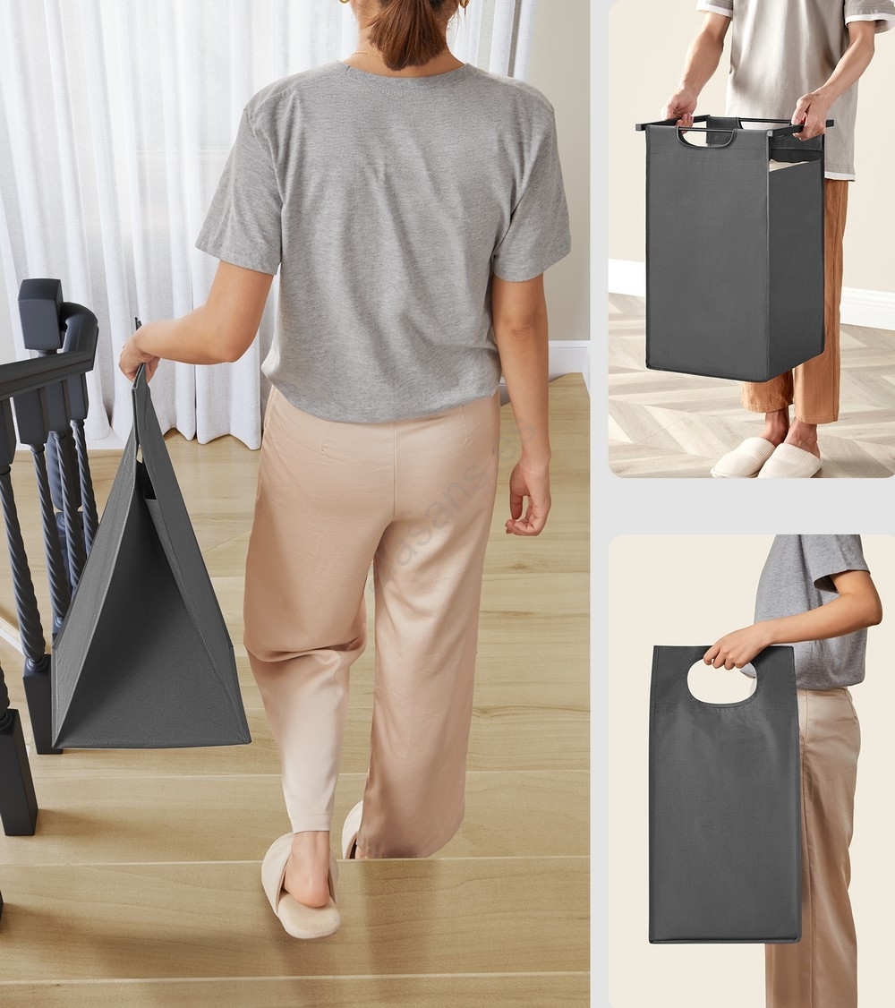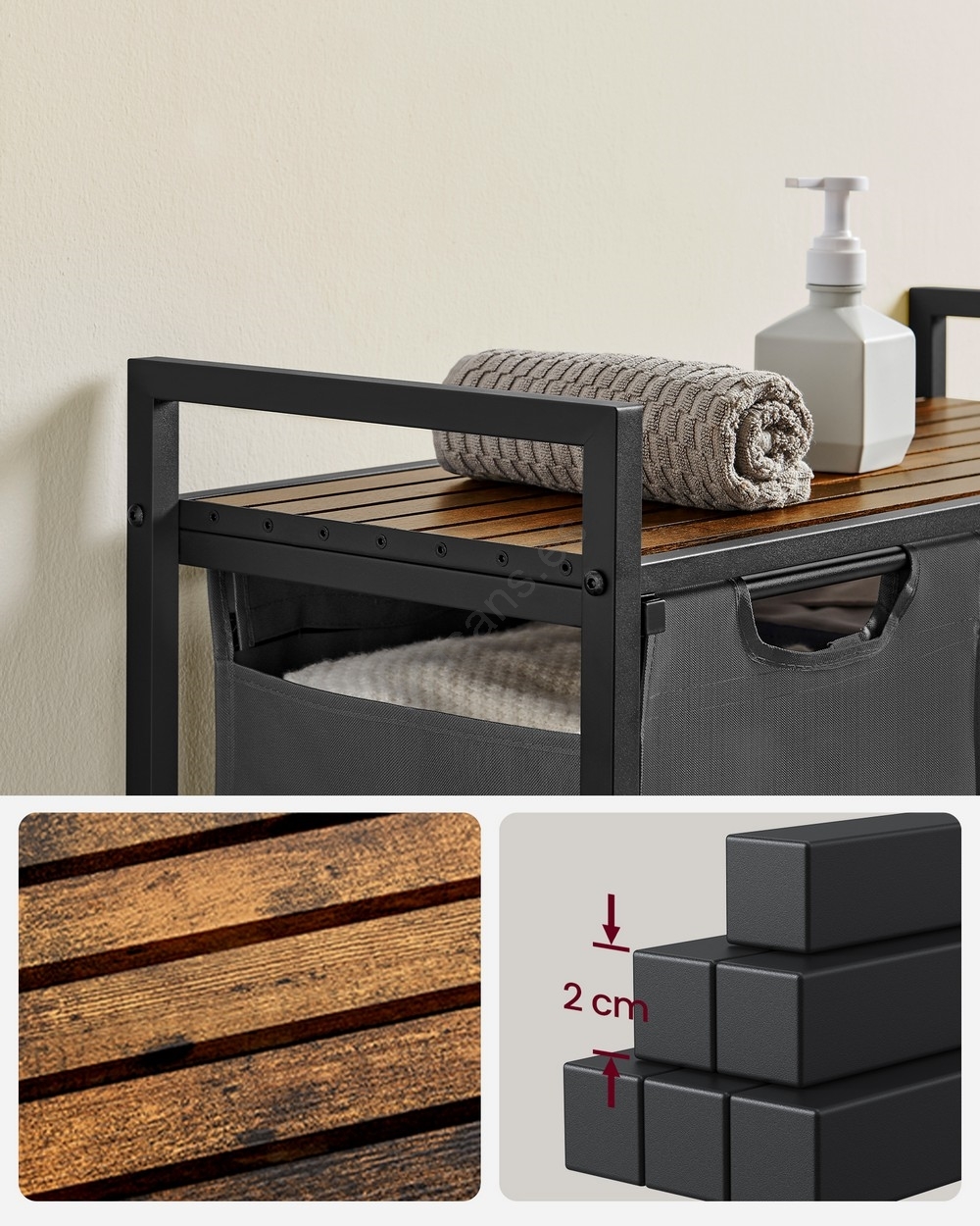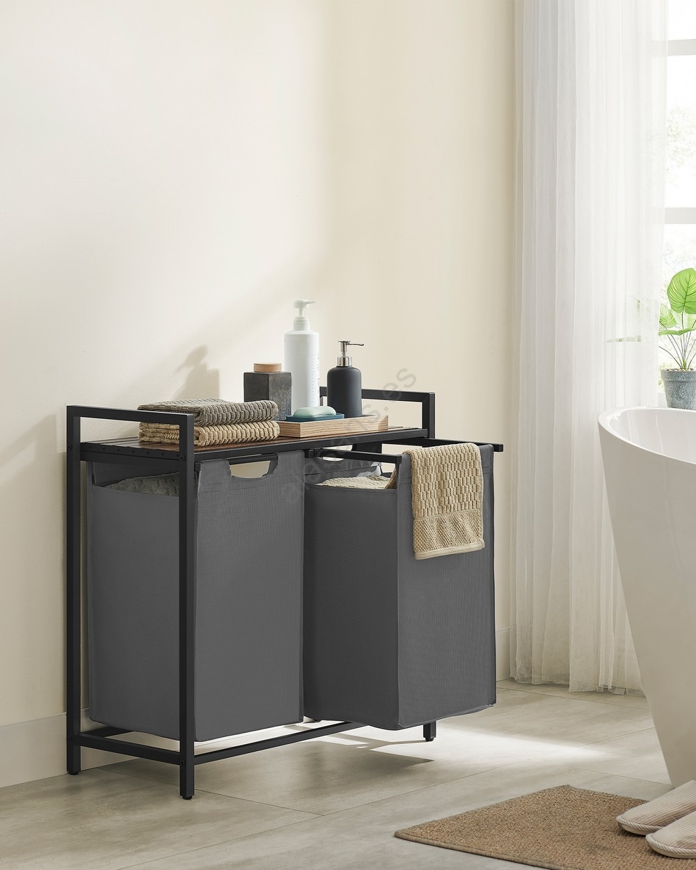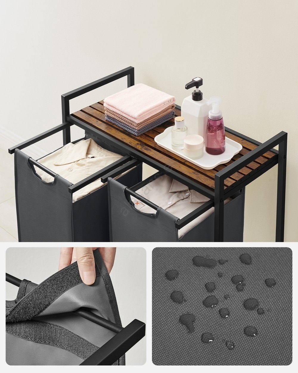• 2 bolsas, 1 balda – Separe la ropa en dos bolsas de tela (46 l por bolsa) y coloque detergentes, suavizante y otros accesorios en la balda.