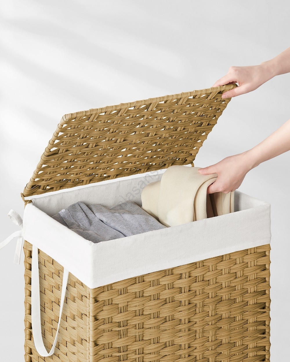 • Cuidadosamente elaborado, este cesto tejido a mano en ratán sintético es la pieza que faltaba para ocultar la ropa sucia y mantener el orden perfecto en su hogar.