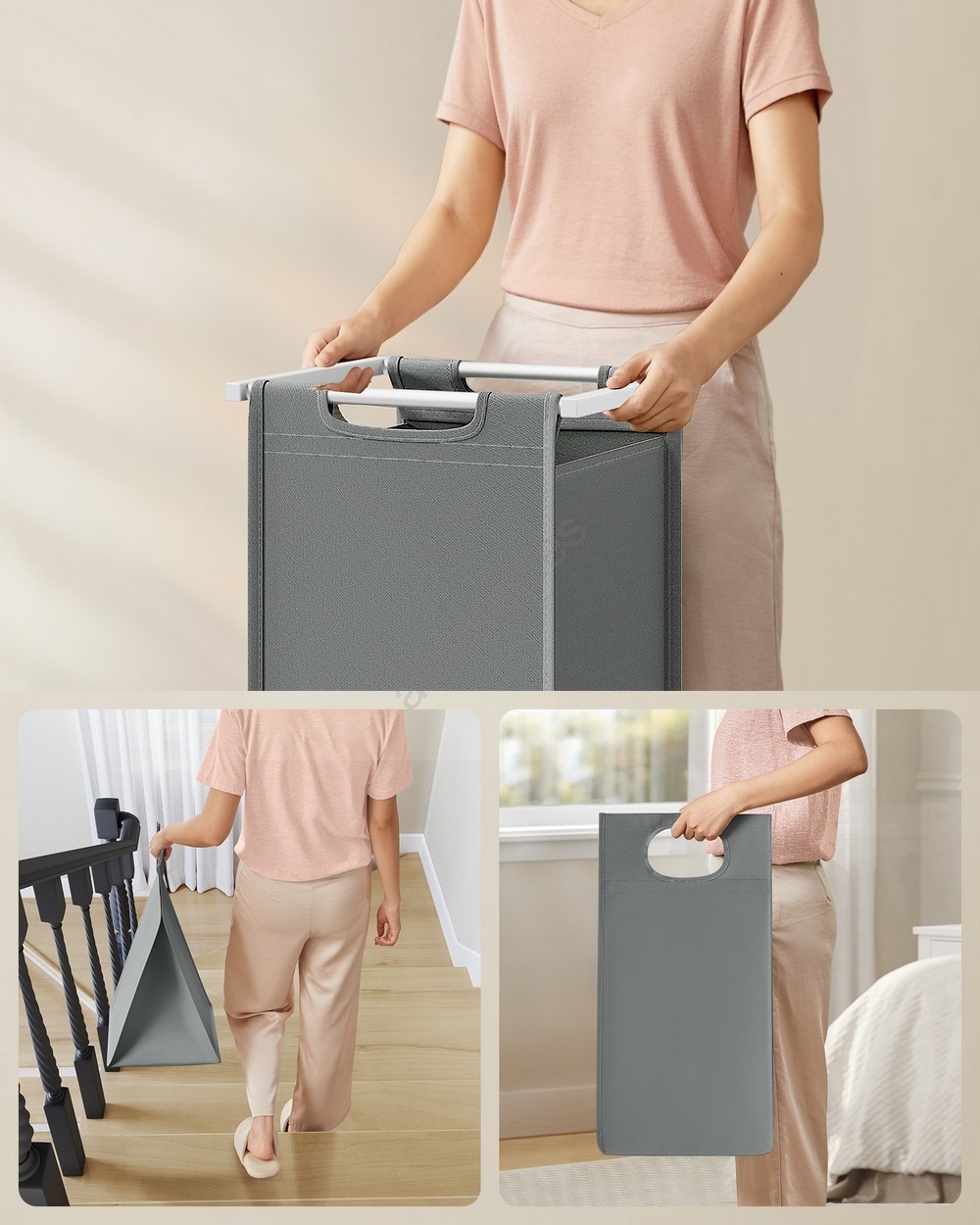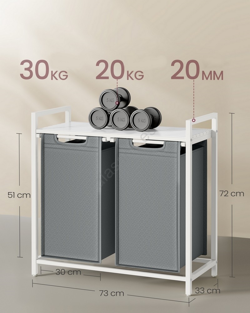 • 2 bolsas, 1 balda – Separe la ropa en dos bolsas de tela (46 l por bolsa) y coloque detergentes, suavizante y otros artículos en la balda.