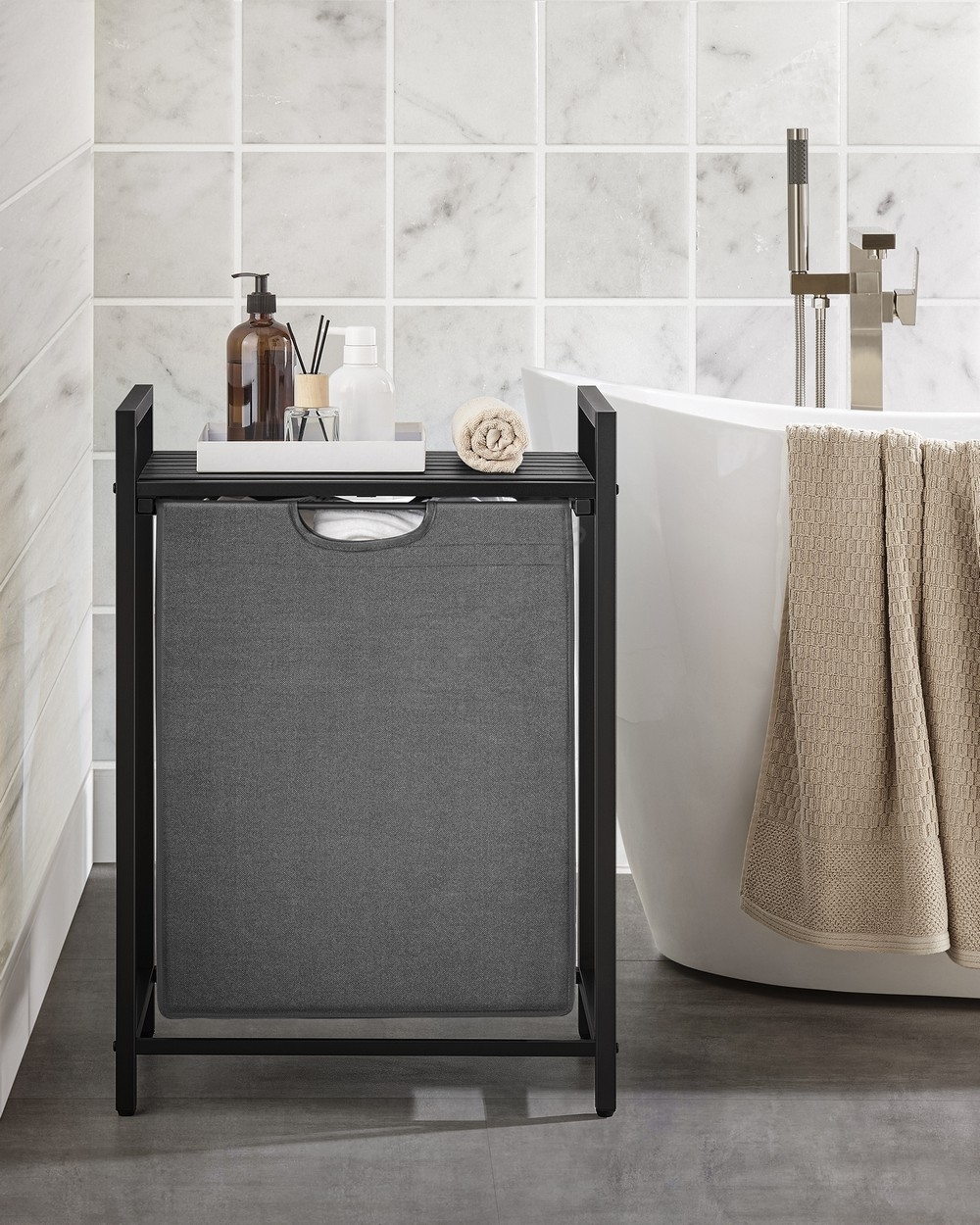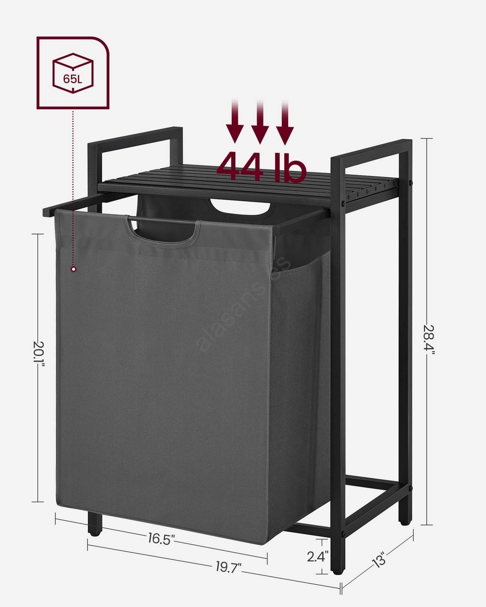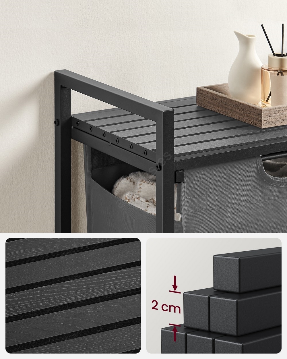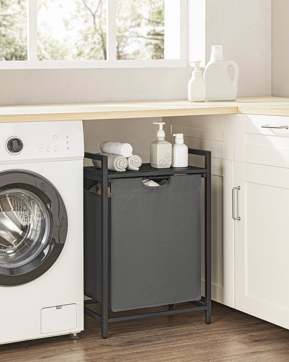 • 1 bolsa, 1 estante – Guarde la ropa en la bolsa de tela (65 l) y coloque detergentes, suavizante y otros artículos en el estante superior.