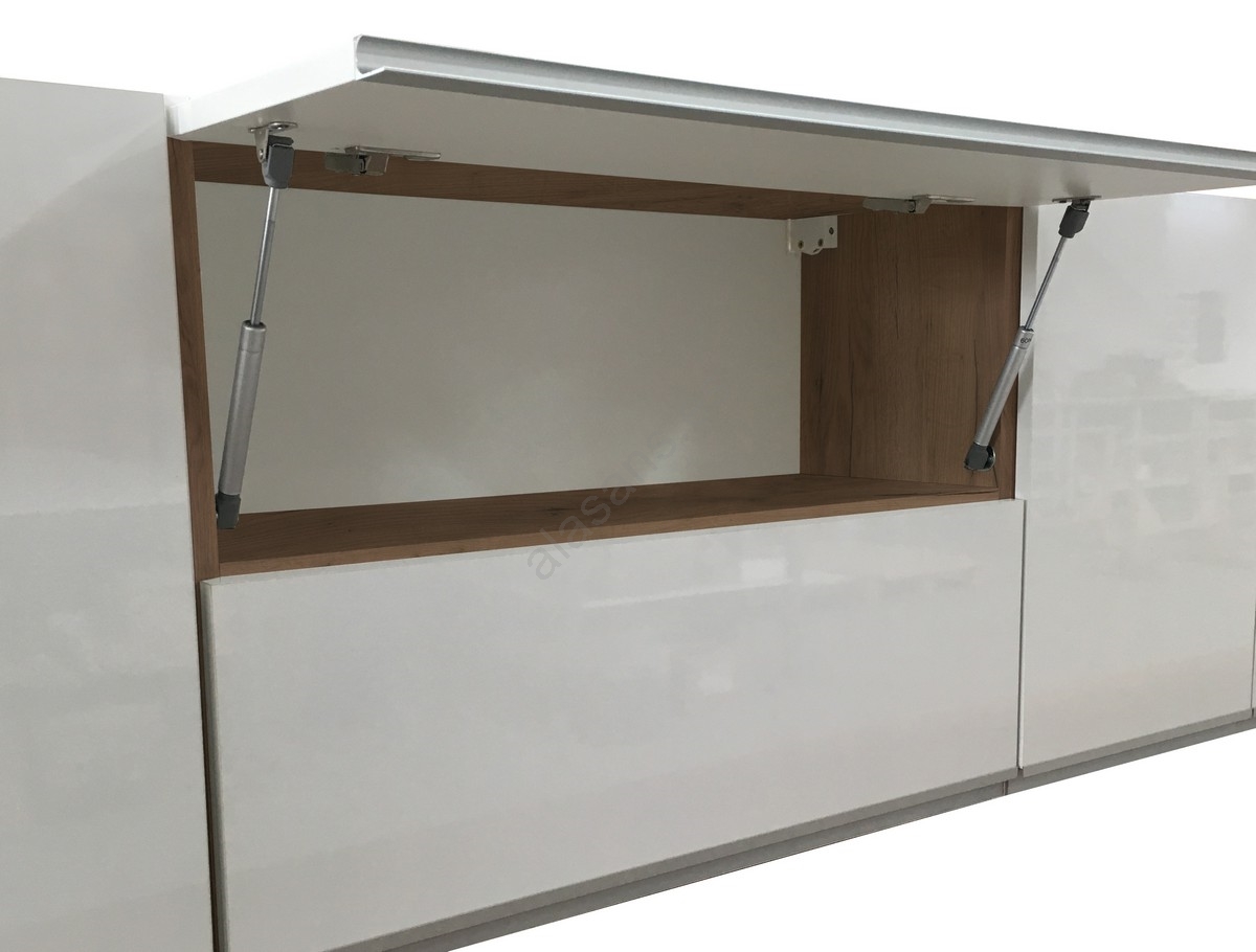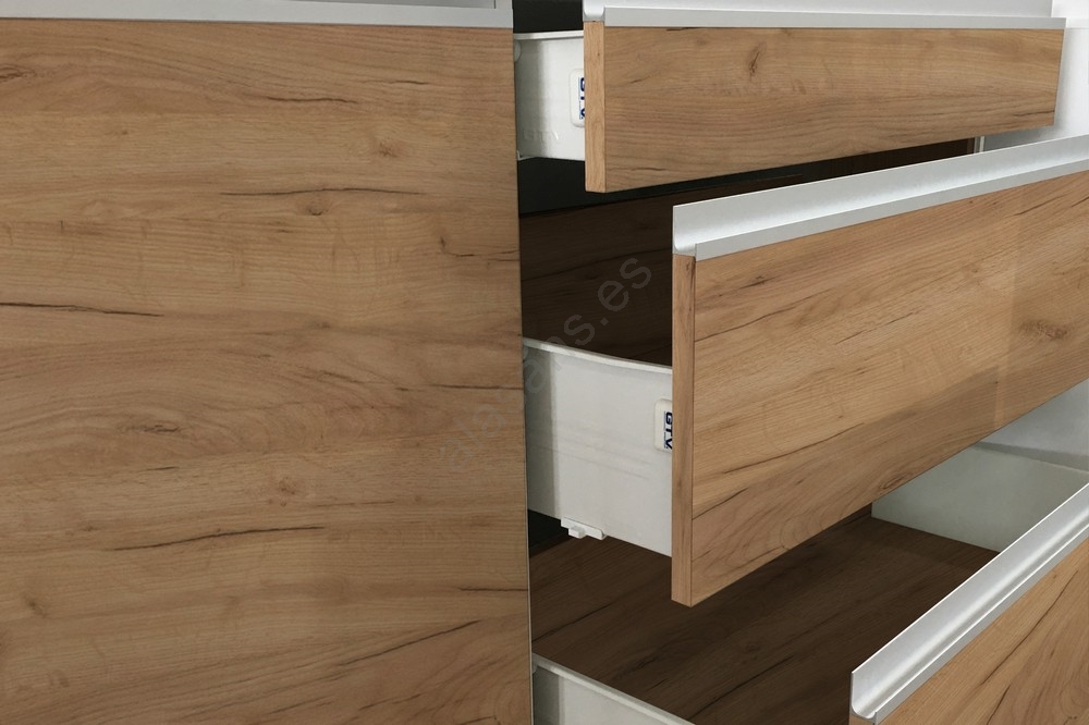 • Armarios superiores están equipados con pistones de gas, en los cajones están integradas guías metálicas encapsuladas de alta calidad.