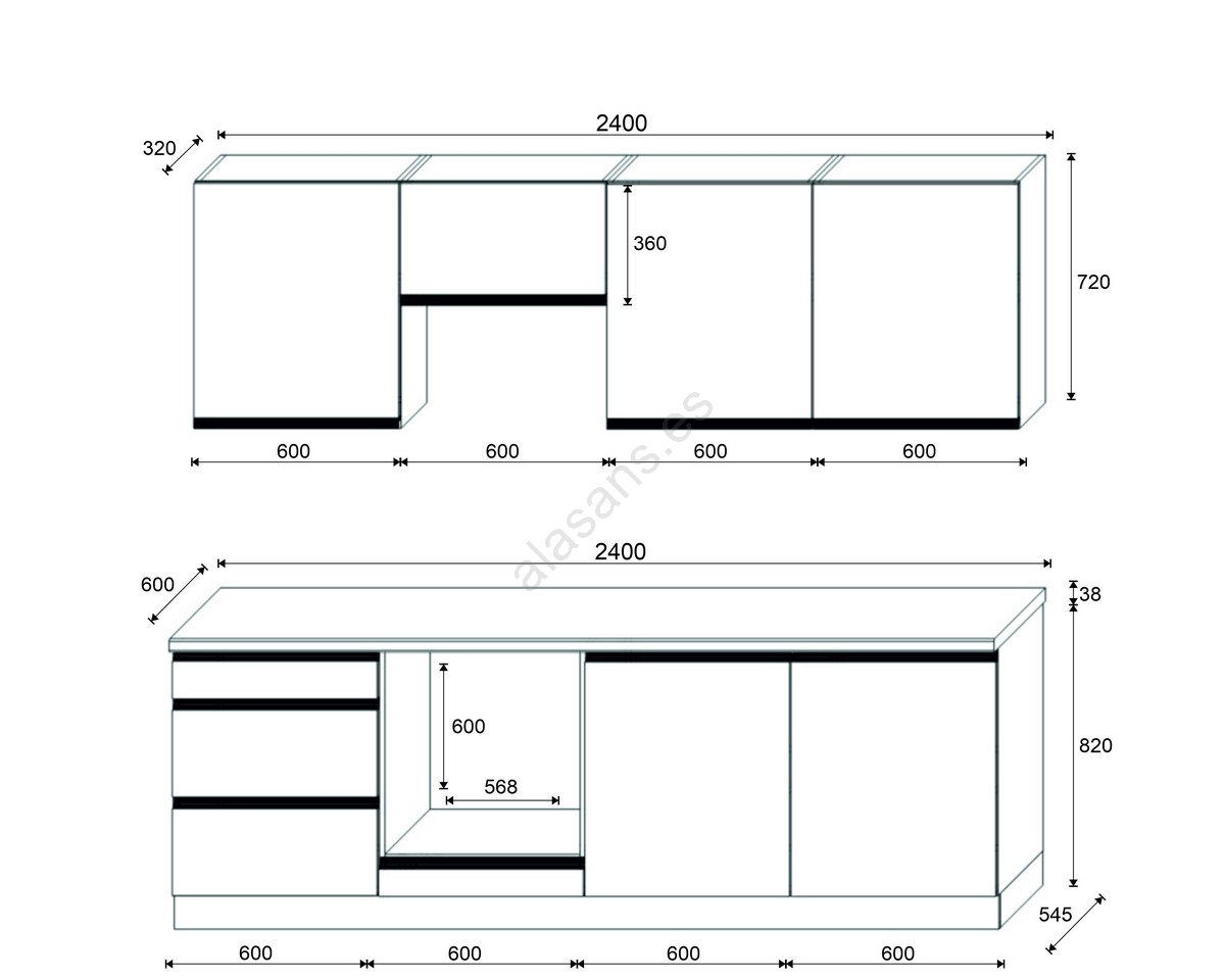 • Ladisposición de los armarios es modular, puede adaptar la cocina a sus propias preferencias.