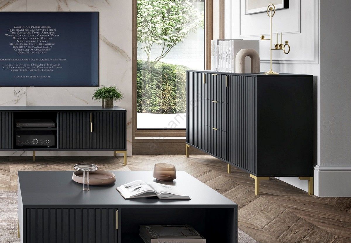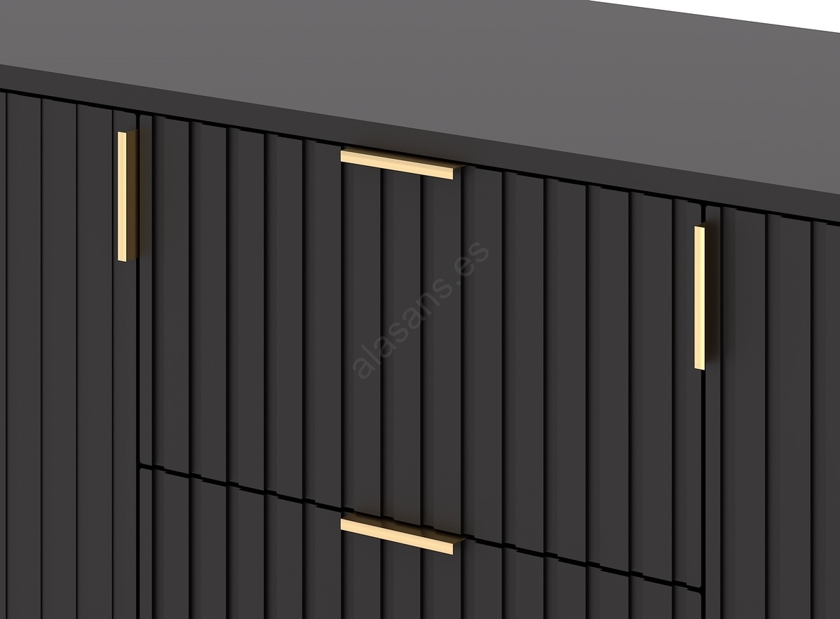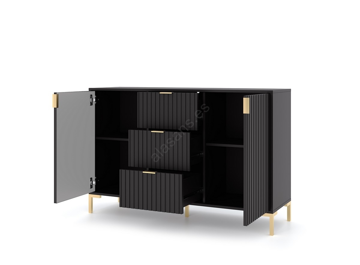 • Cuenta con cuatro estantes, dos puertas y tres cajones con estriado vertical.