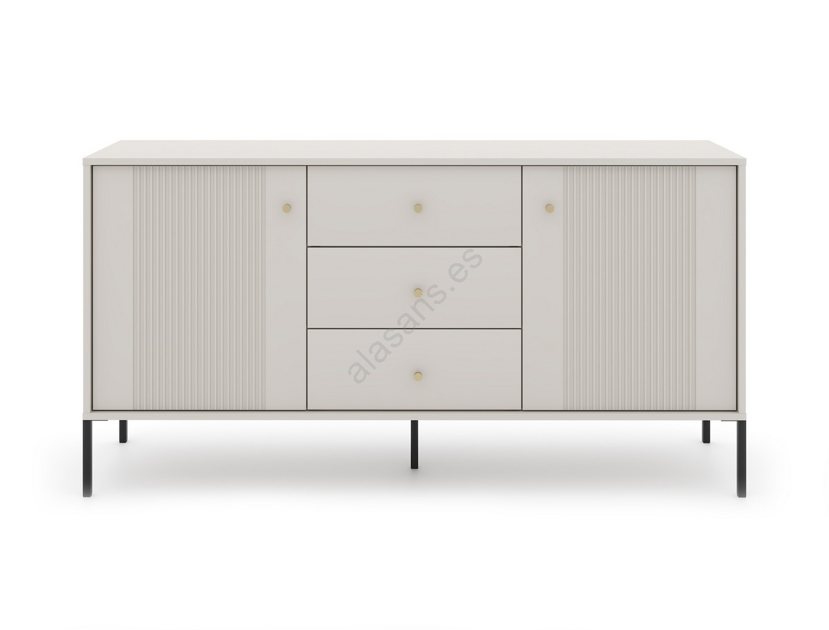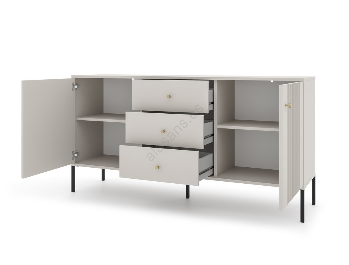 • Dispone de tres cajones en el centro y dos estantes con puertas con efecto acanalado vertical.