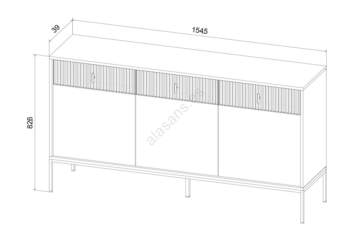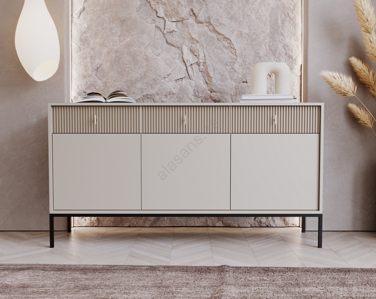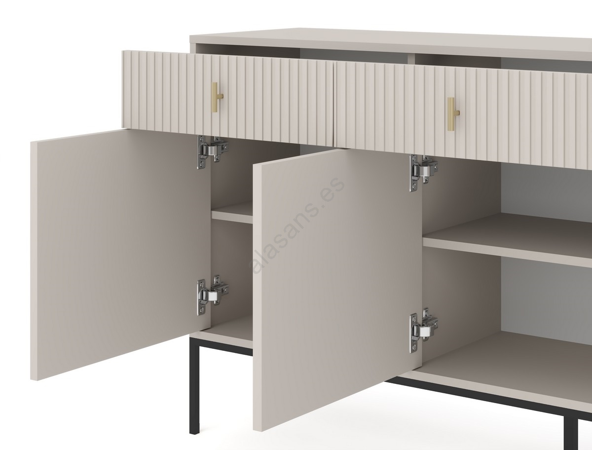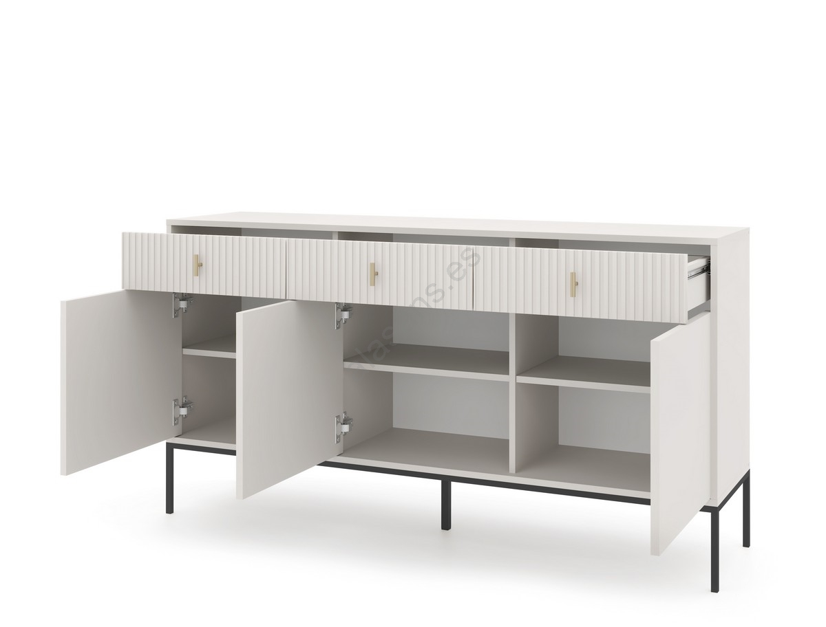 • Cuenta con tres puertas inferiores con amplio espacio de almacenamiento y tres cajones con tiradores y acanalado vertical.