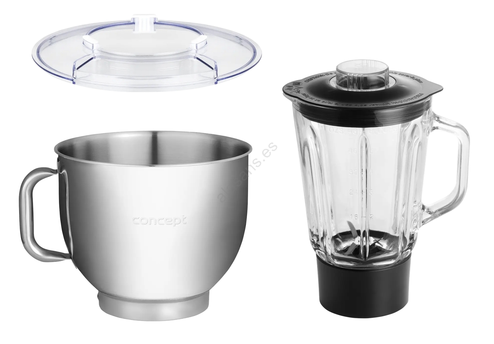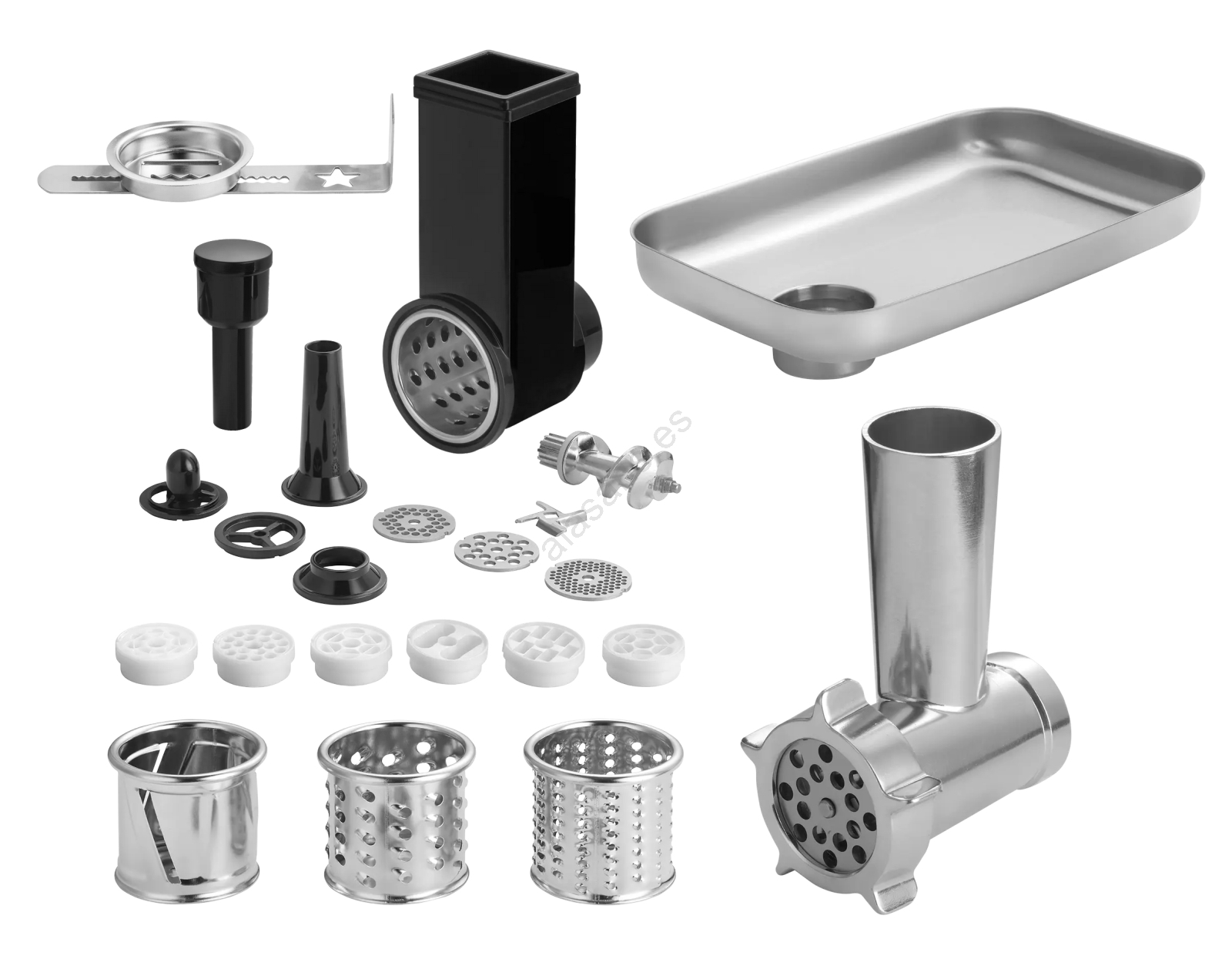• Accesorios incluidos: 2 ganchos amasadores, Batidor totalmente metálico, Pala mezcladora, Recipiente de acero inoxidable con asa 7 l, Tapa de plástico, Licuadora de vidrio (1,5 l), Picadora de carne (3 discos), Máquina para pasta (6 accesorios para elaborar pasta casera), Formador de galletas (molde para galletas), Embutidora (accesorio para rellenar salchichas), Accesorio para formar albóndigas, Rallador (3 accesorios).