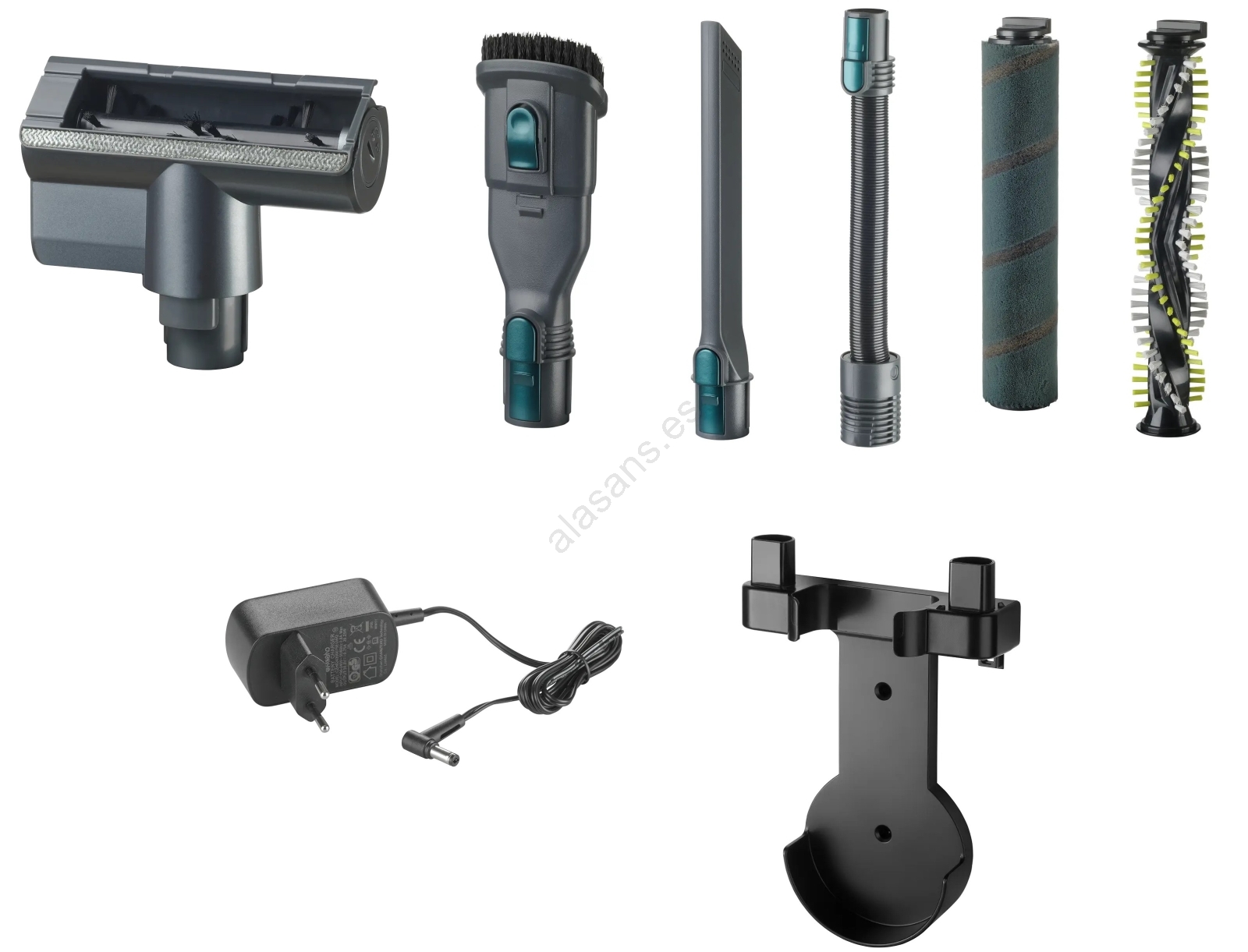 • Accesorios incluidos: cepillo para suelos duros, cepillo para alfombras, manguera flexible, boquilla para ranuras, boquilla con cepillo, turbocepillo pequeño, soporte de pared.