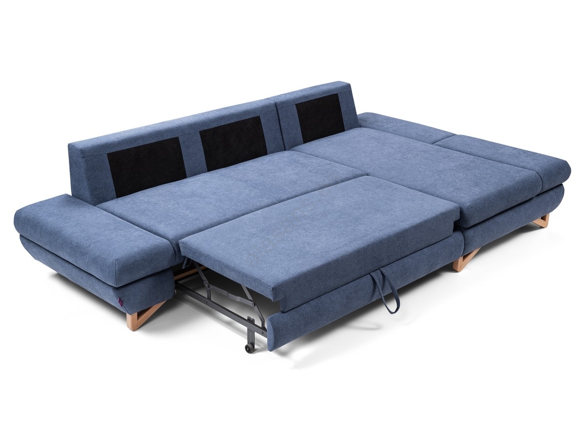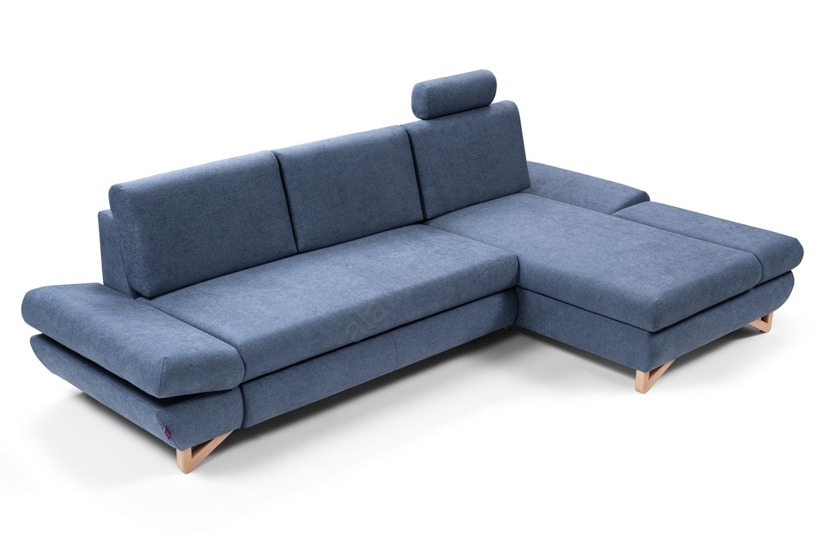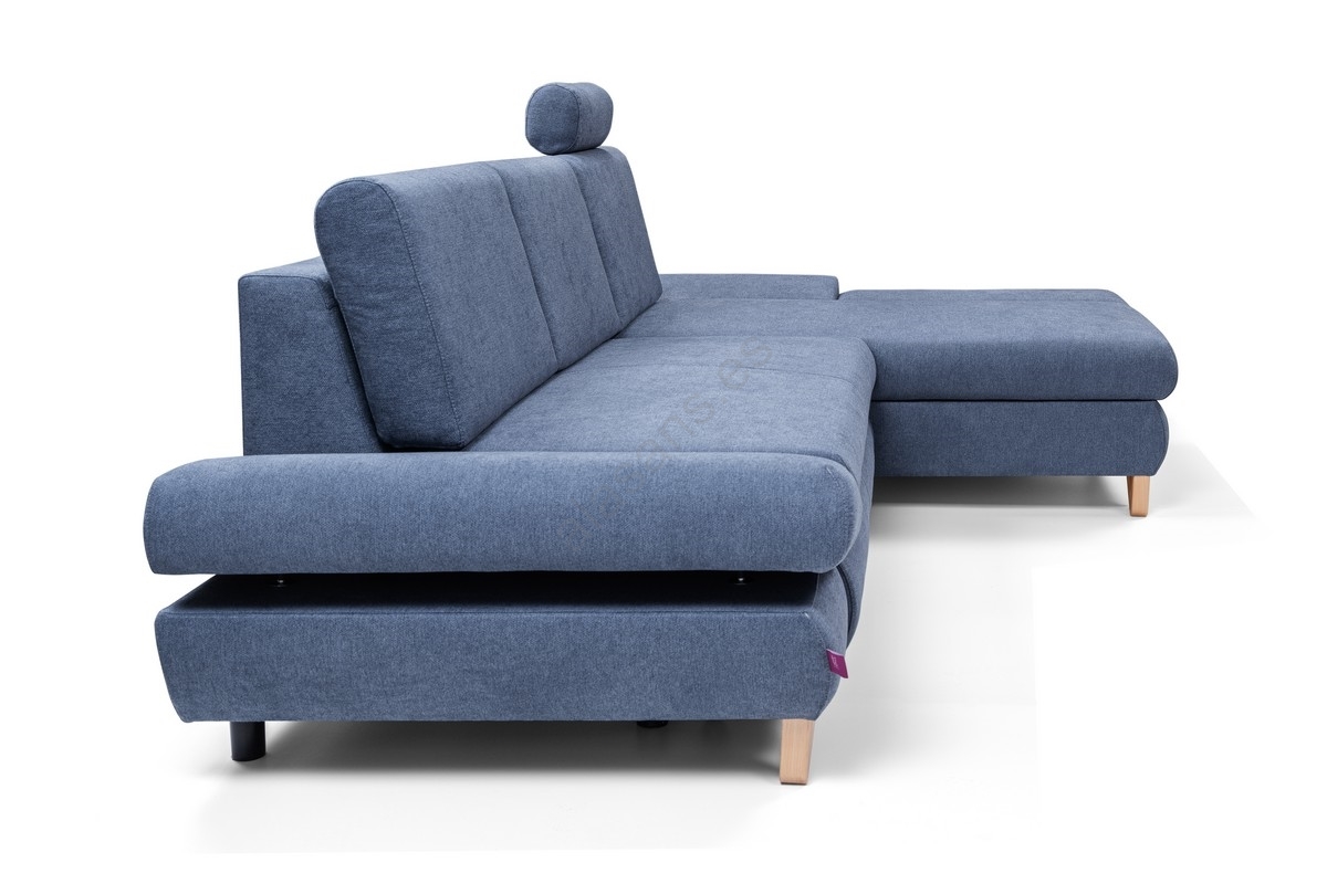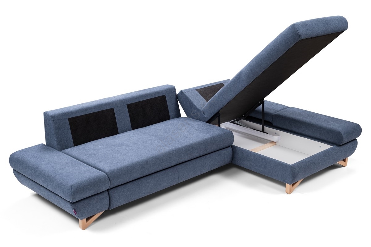 • Sofá esquinero tapizado en L, convertible en cama, con arcón de almacenamiento AVESTA, orientación derecha, azul