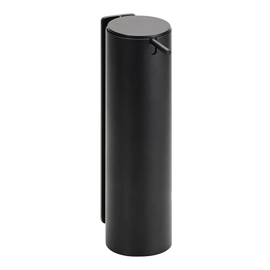 • Elegante dispensador de jabón en acabado negro para baños modernos.