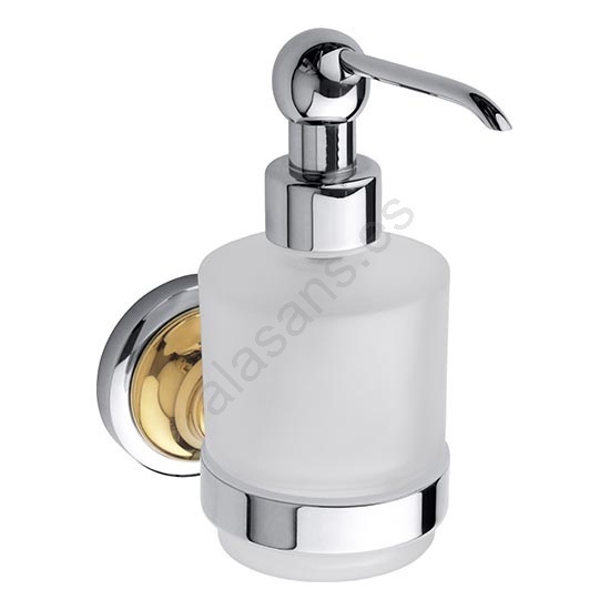 • Elegante dispensador de jabón en combinación de cromo y dorado para un aspecto lujoso en el baño.