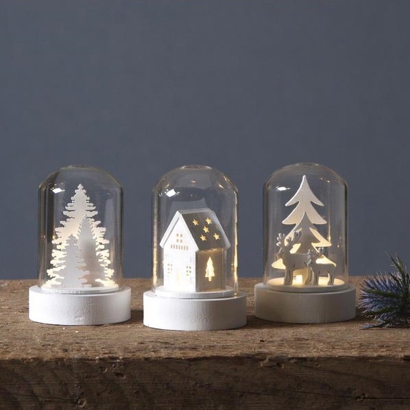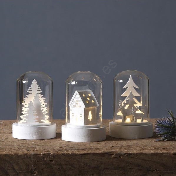 • Conjunto de adornos navideños de LED con figuras de madera en su interior.