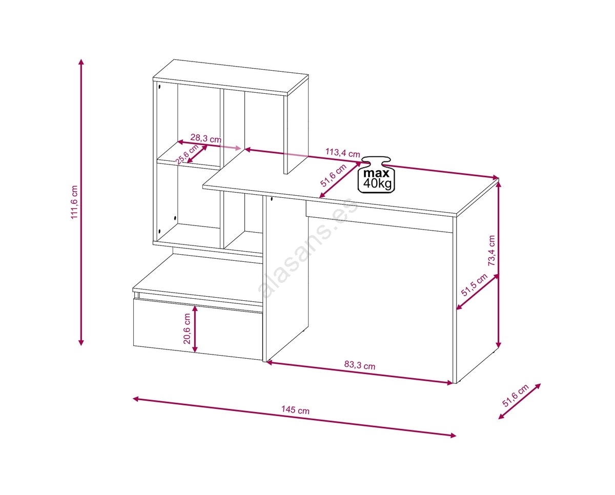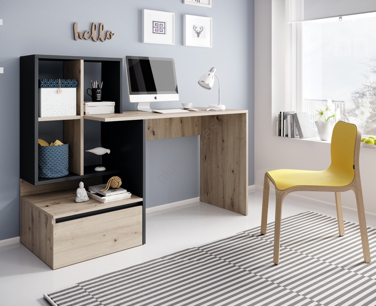 • La superficie de trabajo rectangular se apoya en una estantería lateral con dos baldas abiertas, ideales para guardar libros, material de oficina o elementos decorativos.