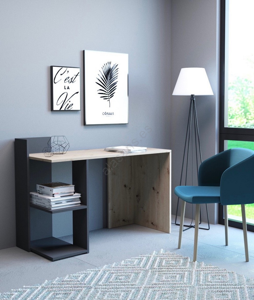 • La superficie de trabajo rectangular está sostenida por una estantería lateral con dos baldas abiertas, ideales para guardar libros, material de oficina o elementos decorativos.