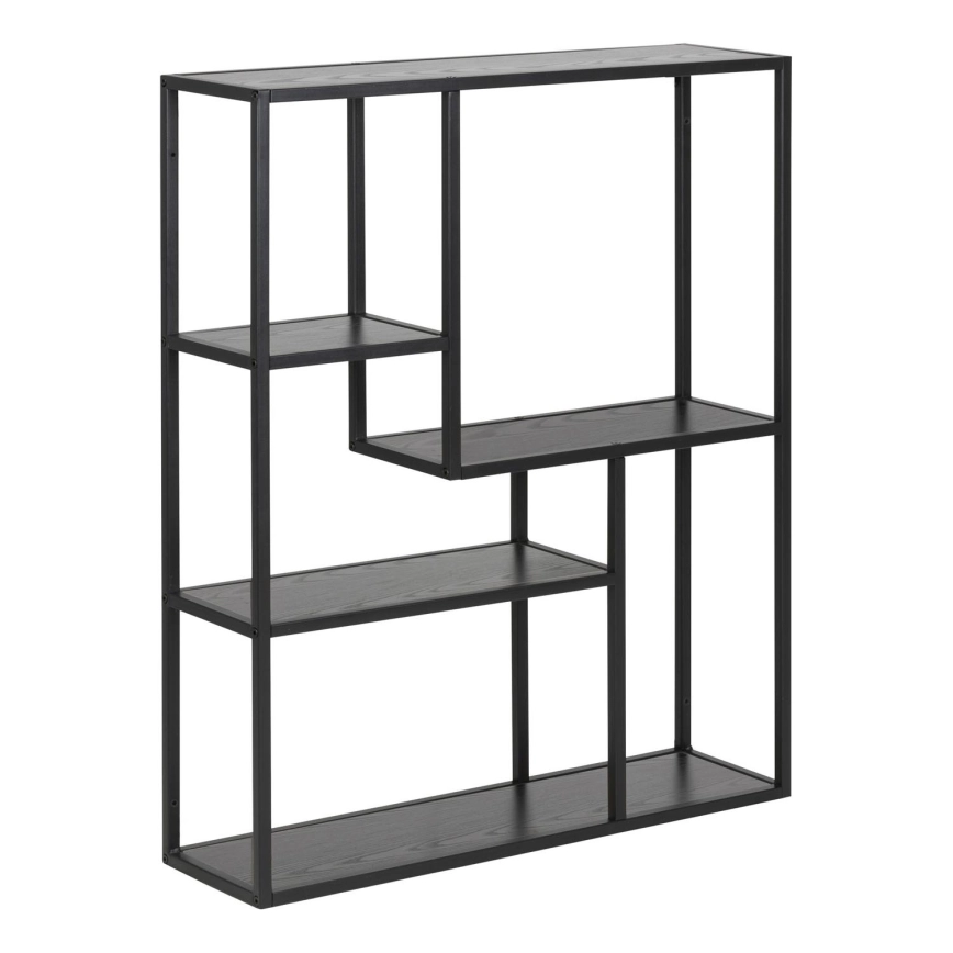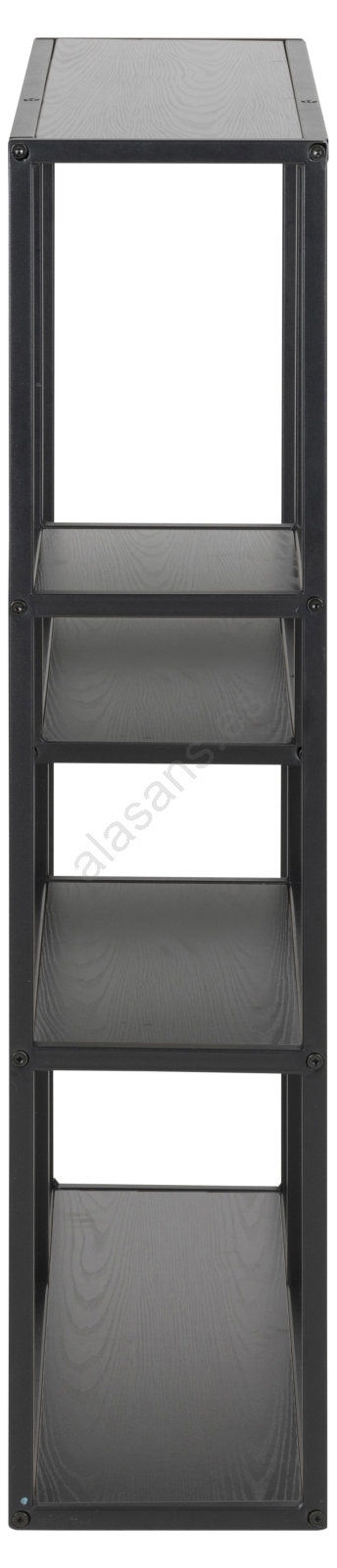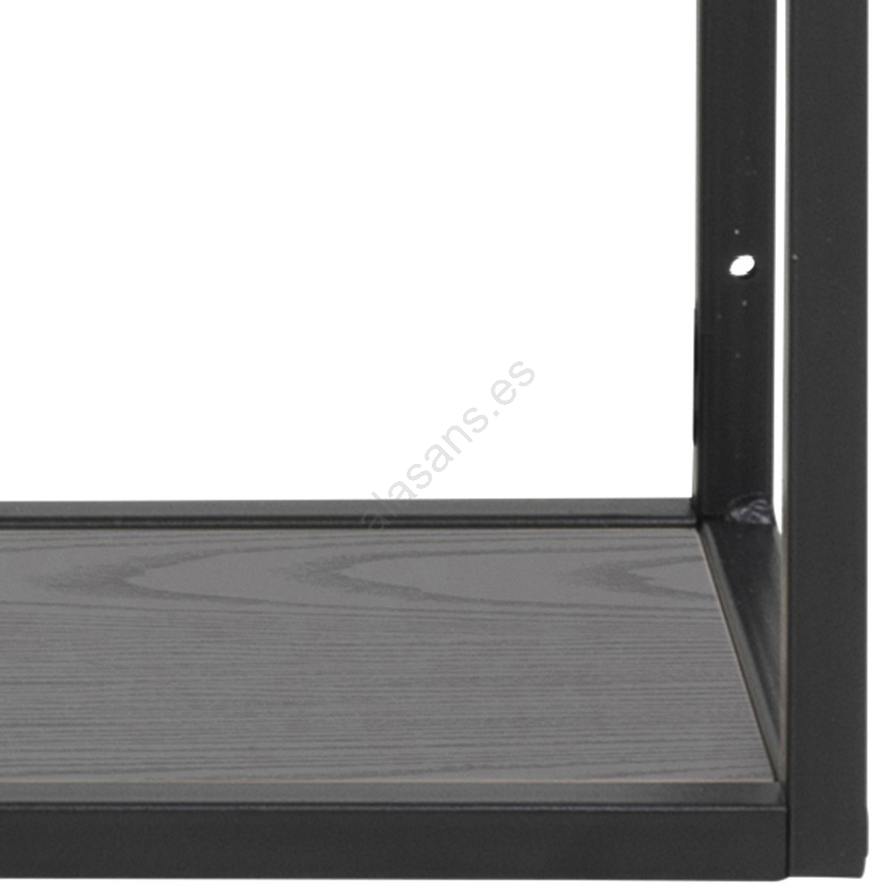 • Marco de acero con recubrimiento de pintura en polvo negro mate, 3 baldas de melamina color fresno negro con detalles asimétricos.