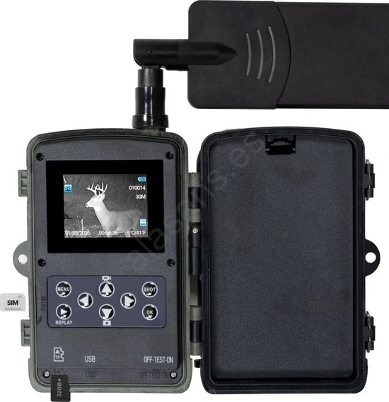 • Contenido del paquete: cámara trampa, antena 4G, tarjeta SD de 32 GB, correa de sujeción, tarjeta SIM, lector de tarjetas y manual.