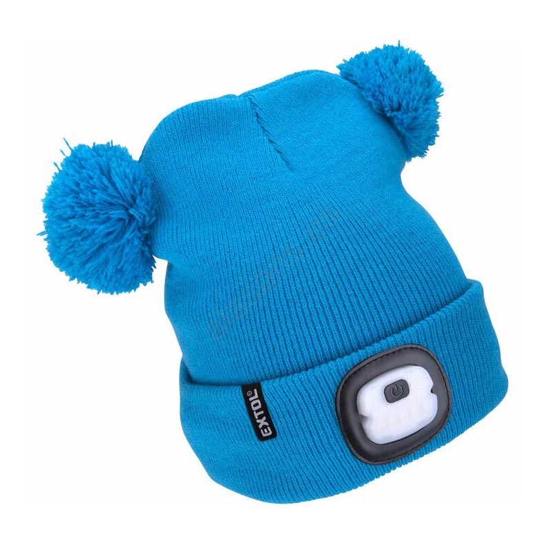 • Extol - Gorro con luz frontal y carga por USB, batería recargable de 250 mAh, azul con pompones, talla infantil
