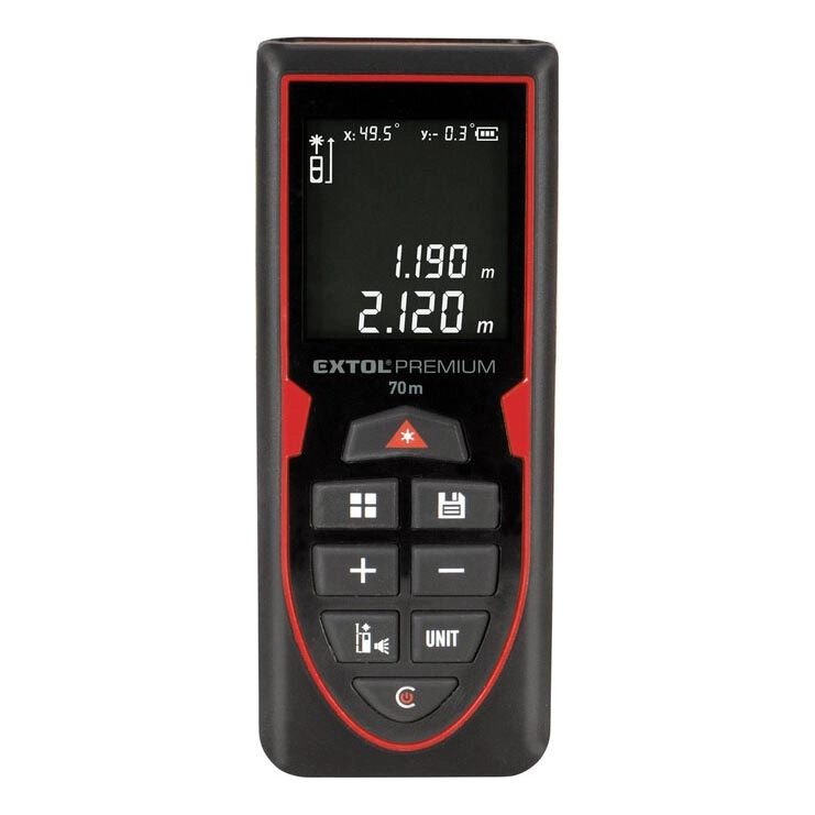 • Funciones de medición: distancia con posibilidad de medición continua (valores min./max.), superficie, volumen, funciones de resta/suma sobre valores ya medidos, mediciones indirectas (por cálculo) mediante goniometría y medición de ángulos (3 cálculos utilizando un único punto de referencia), función de inclinómetro: mide la inclinación tanto en el plano horizontal como en el vertical (°x /°y).