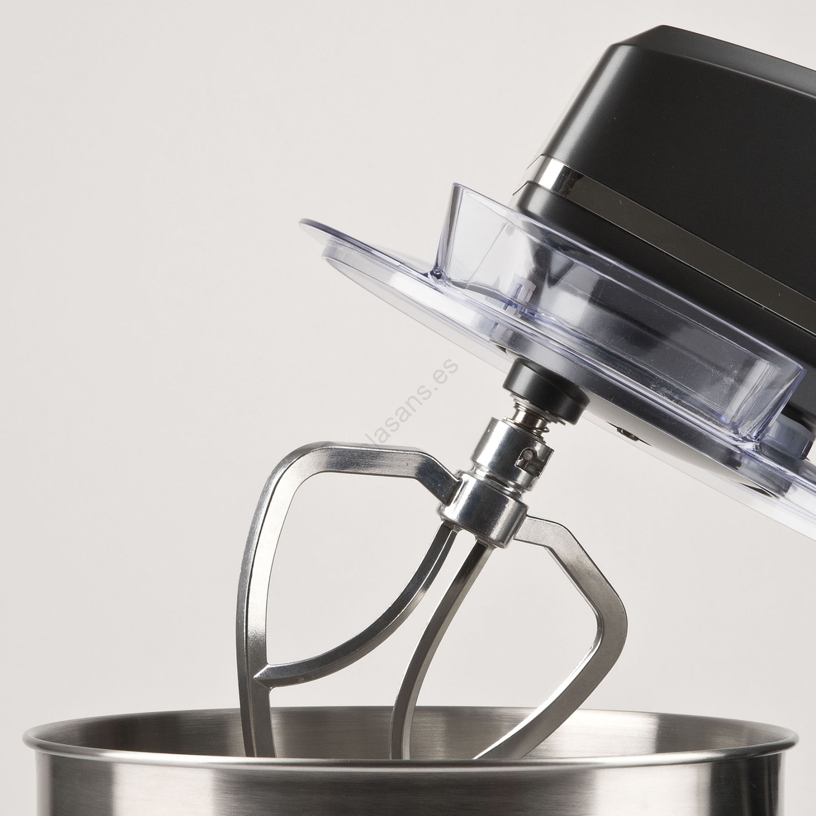 • Juego completo de accesorios: gancho amasador, pala mezcladora, batidor de varillas y tapa transparente del bol.