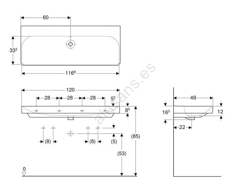 • No dispone de orificio para grifería y cuenta con rebosadero.