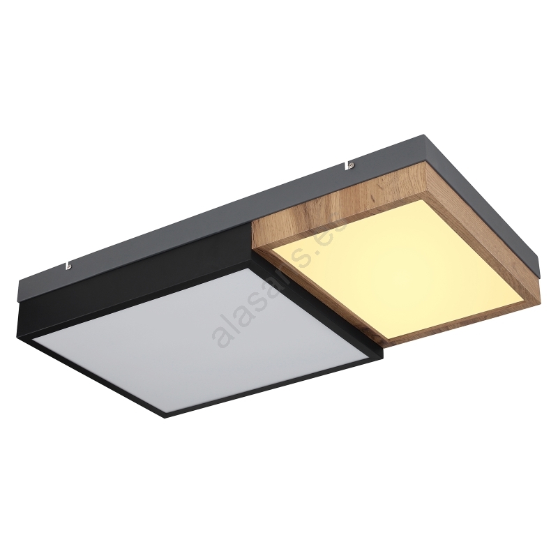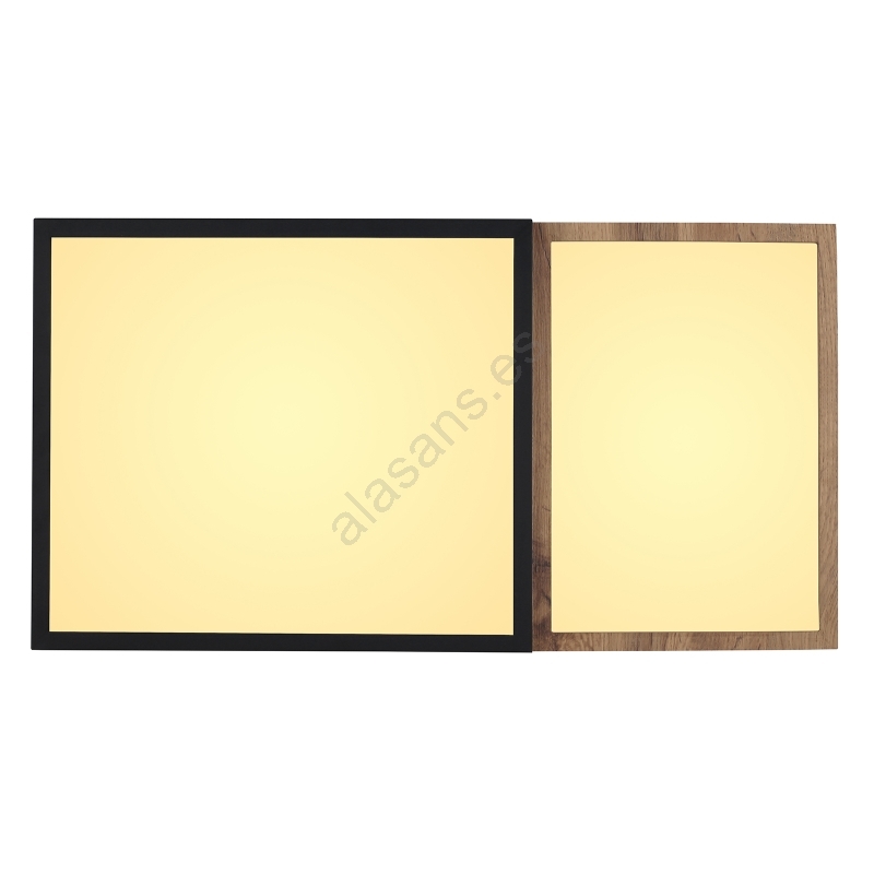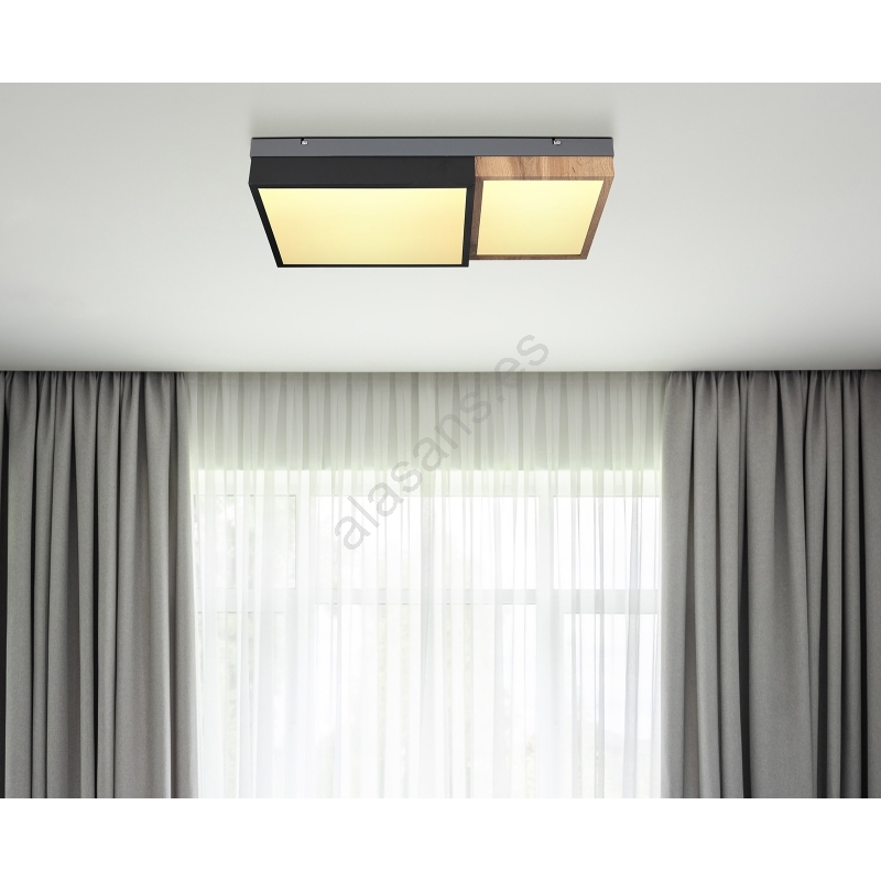 • La luminaria de techo tiene una base metálica gris mate, un marco metálico negro mate, MDF con acabado en madera y plástico opalino, lo que en conjunto aporta un aspecto moderno y a la vez acogedor al interior.