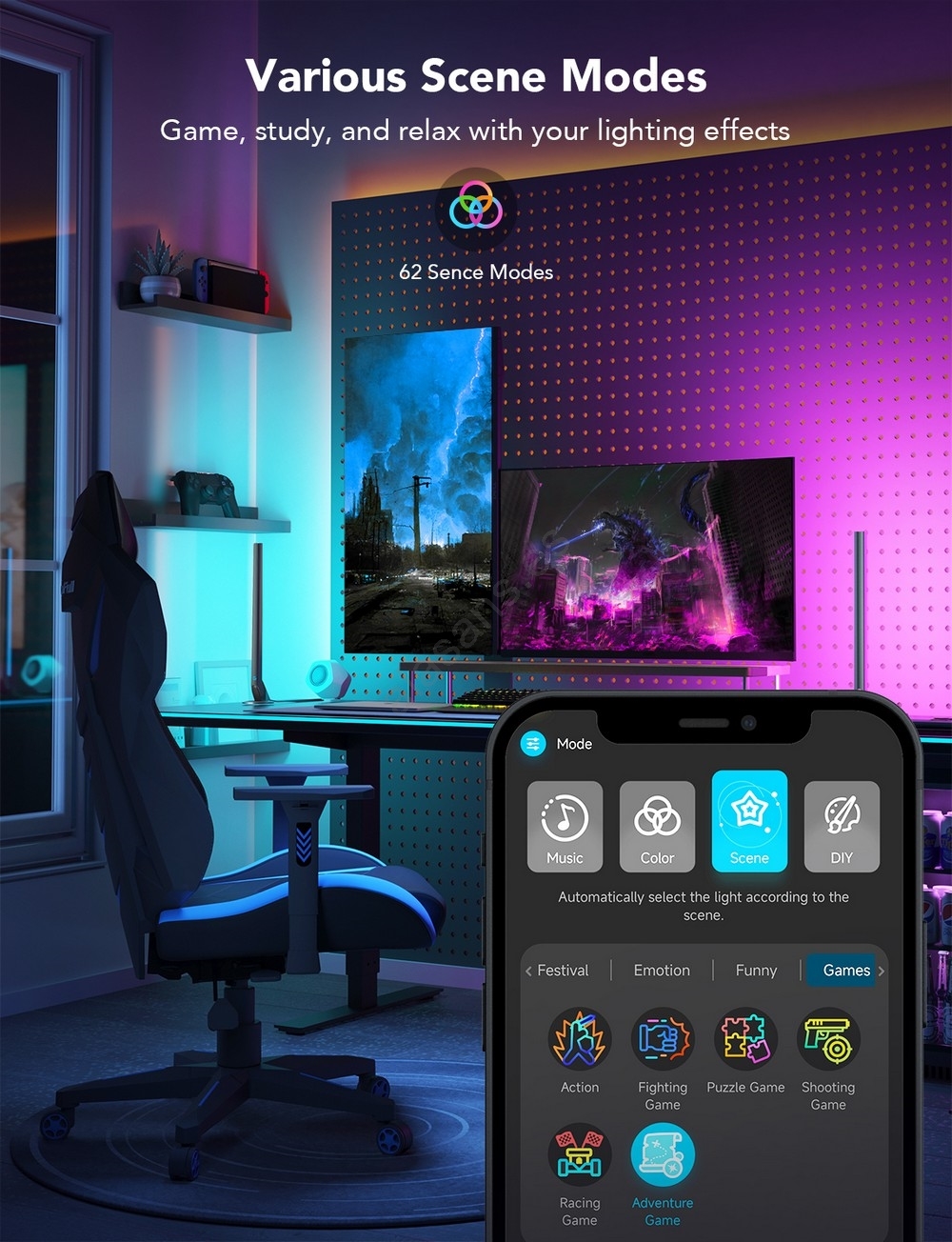 • Modo musical – las luces responden al ritmo y al sonido, dando vida a cada juego y película.