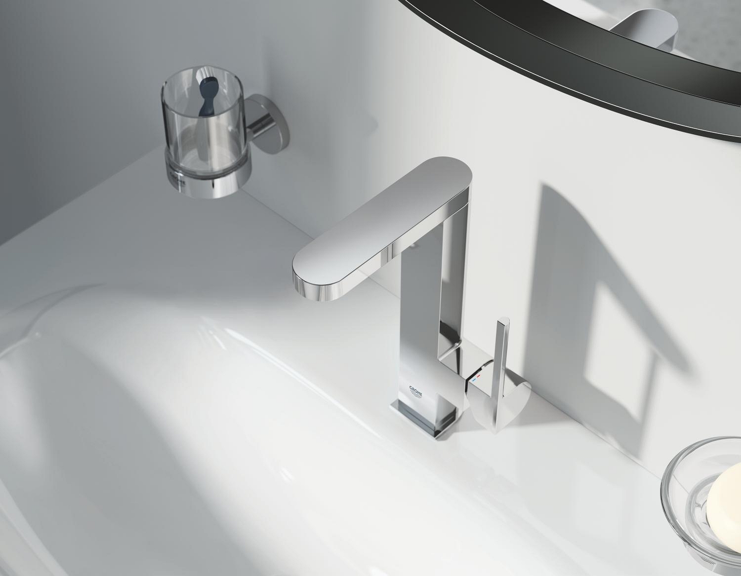 • Diseño moderno de la serie GROHE Plus que combina ángulos marcados con curvas suaves para una estética elegante.