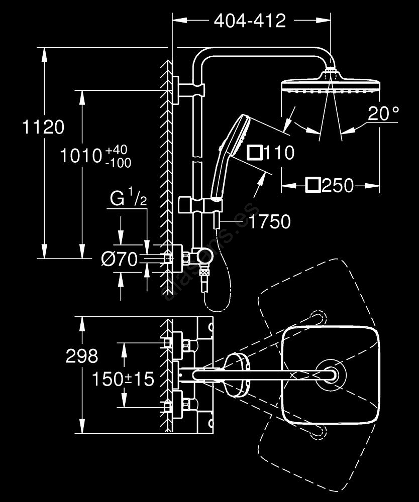 • Grifería termostática de pared con función Aquadimmer que permite cambiar fácilmente entre la ducha superior y la teleducha.
