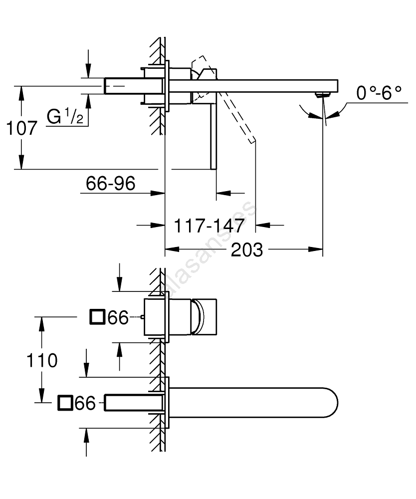 • La distancia entre el centro de la maneta y el caño es de 110 mm; la longitud del caño es de 203 mm.