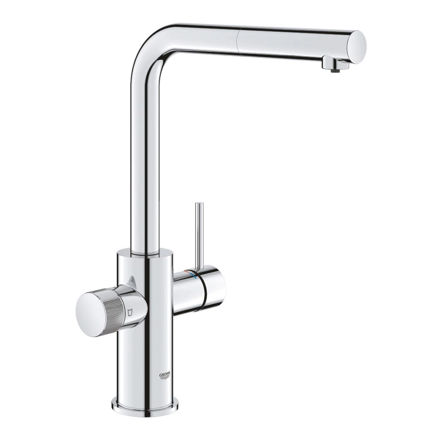 • Grifo monomando para fregadero GROHE Blue con función de filtración integrada para agua potable limpia directamente del grifo.