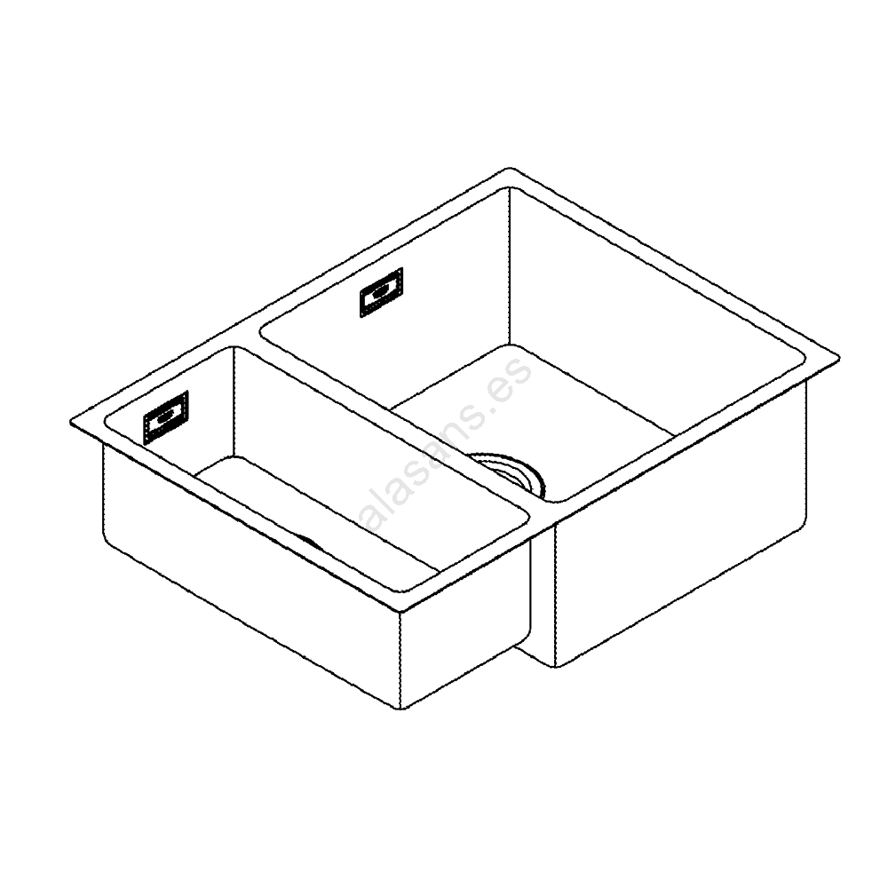 • Dimensiones totales del fregadero 595 x 450 mm, cubeta principal 340 x 400 x 200 mm, cubeta secundaria 180 x 400 x 140 mm.