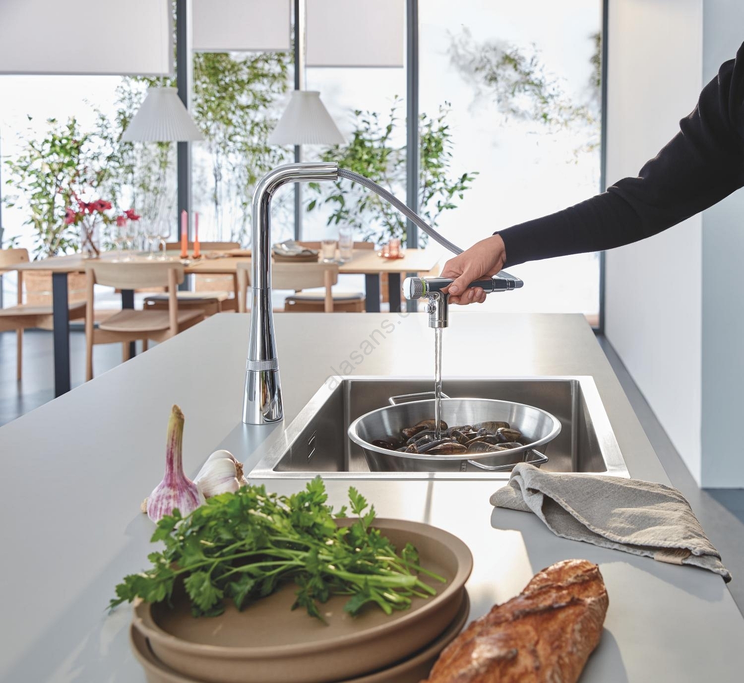 • Fregadero moderno de acero inoxidable GROHE K700 con diseño industrial.