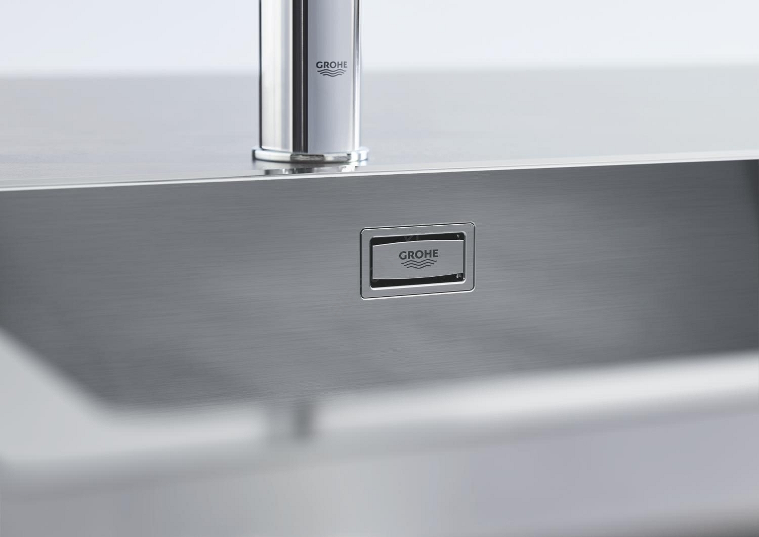 • Fregadero de acero inoxidable moderno GROHE K700 con diseño industrial.